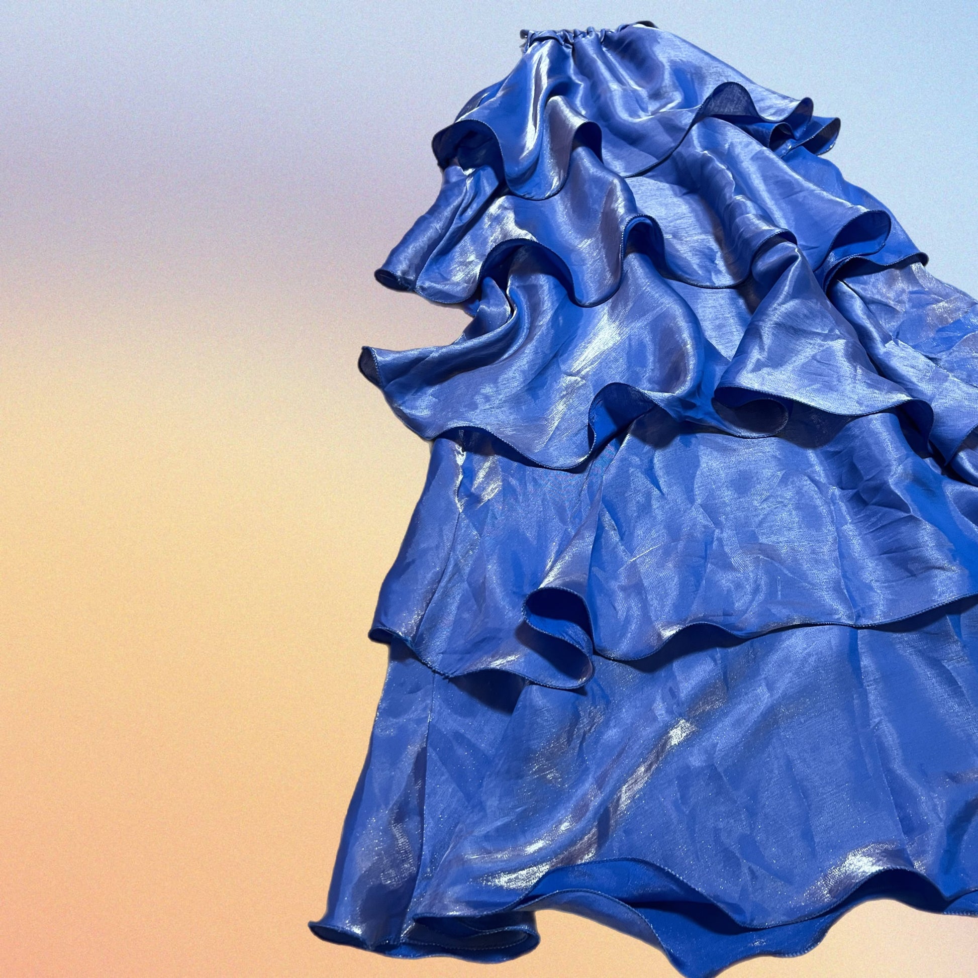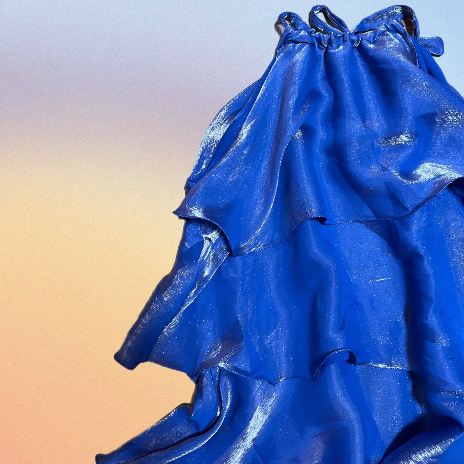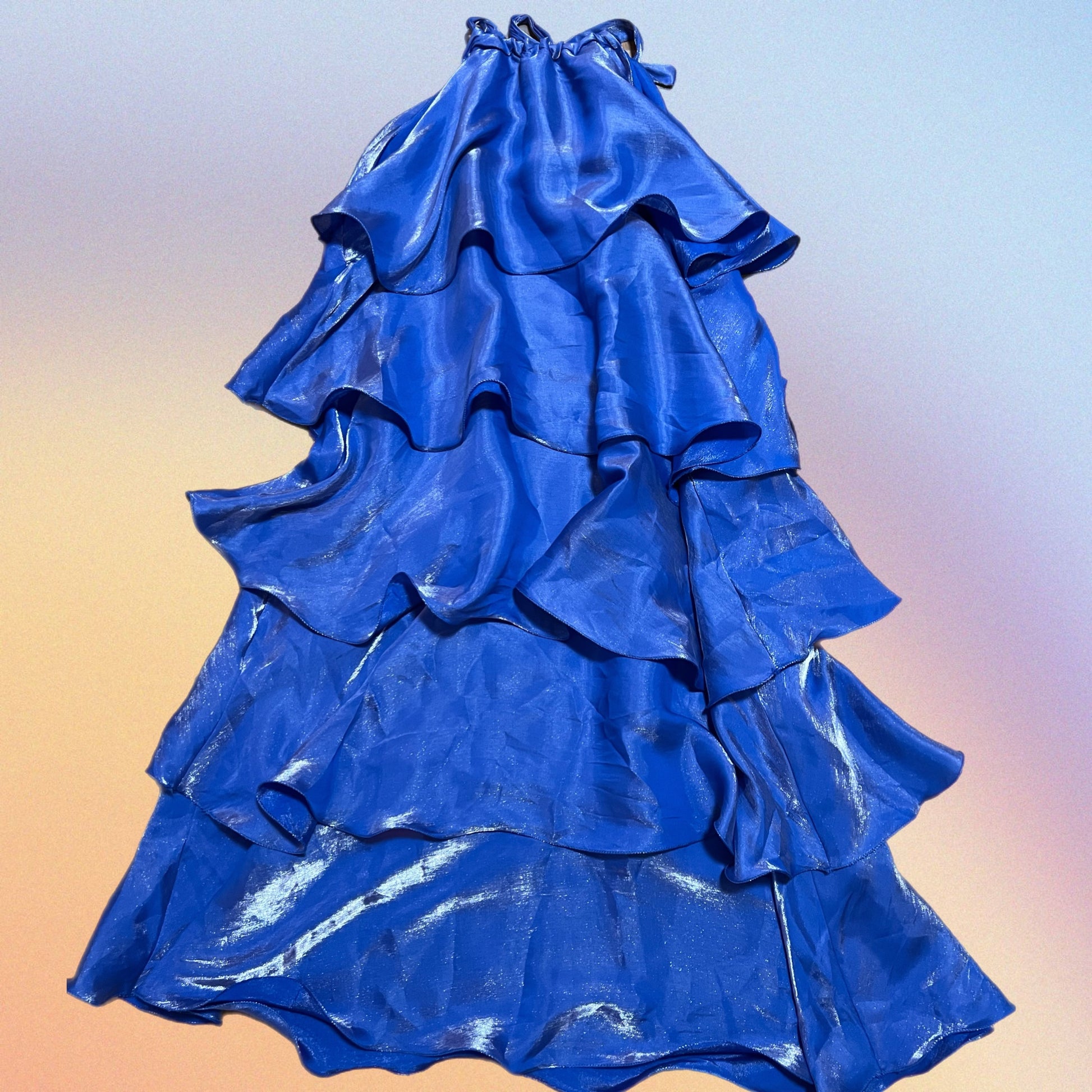 Abito a balze in tessuto viscosa spalmato. Taglia Unica, regolabile dietro il collo.