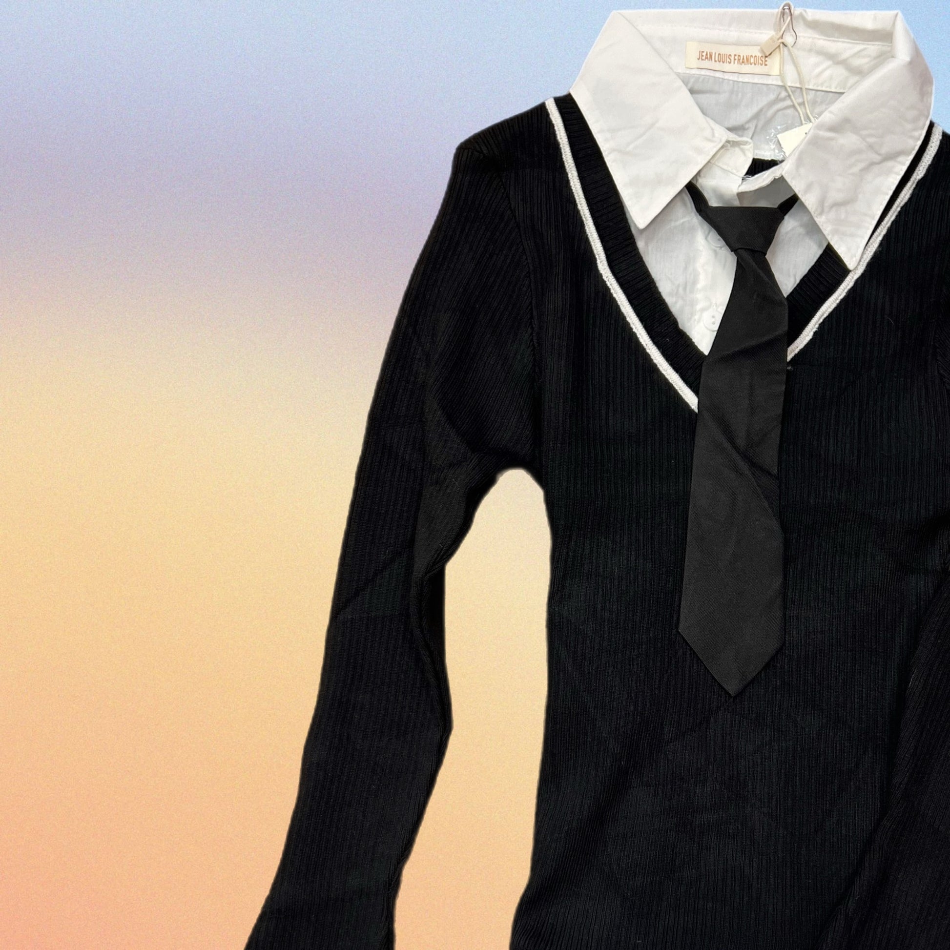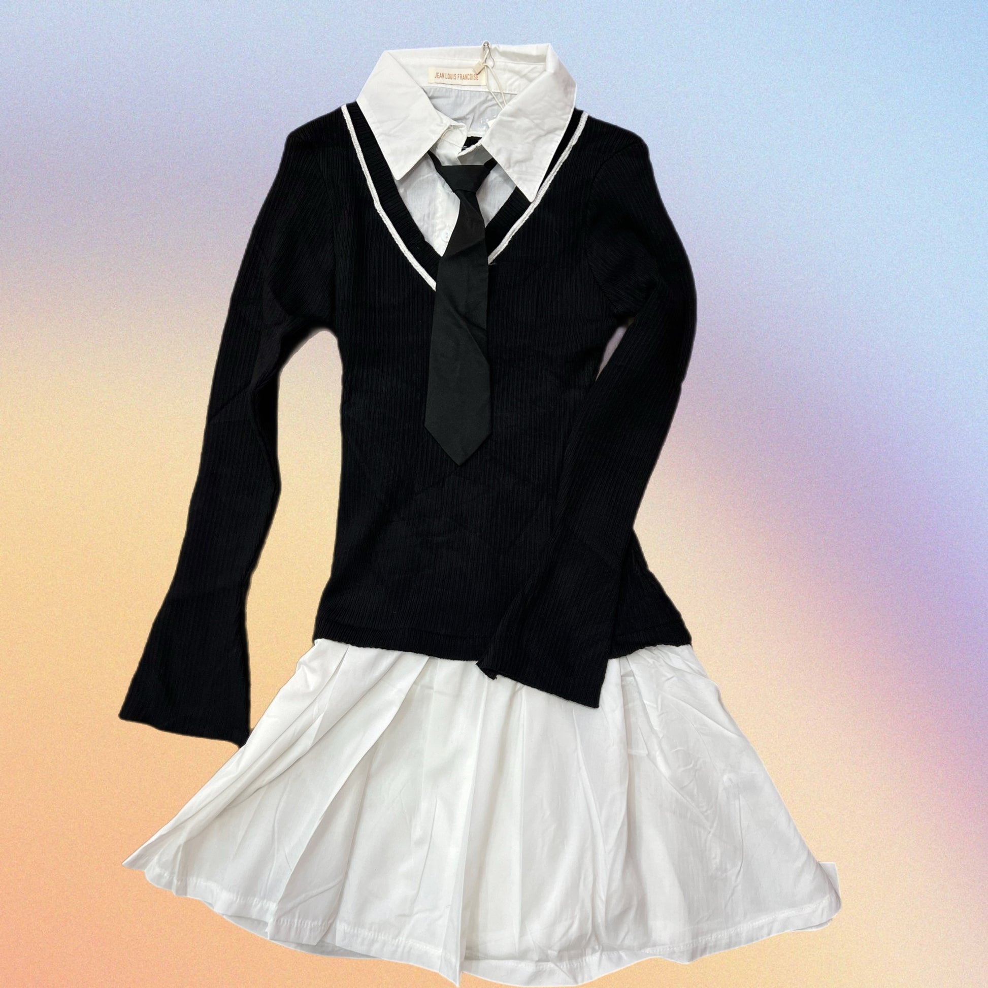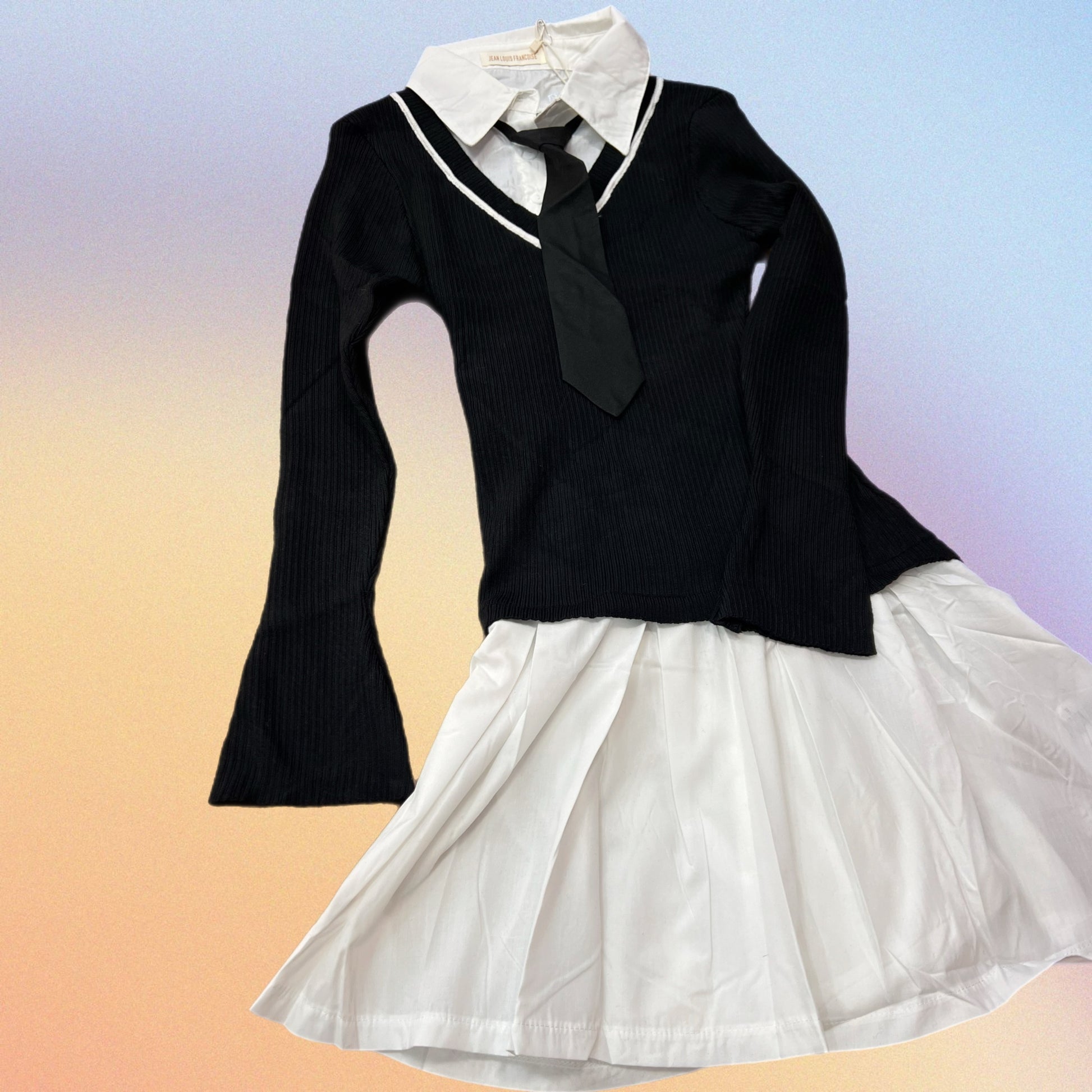 Abito svasato con camicia e cravattina incorporata. Parte sopra in maglina di cotone. Parte sotto in cotone.