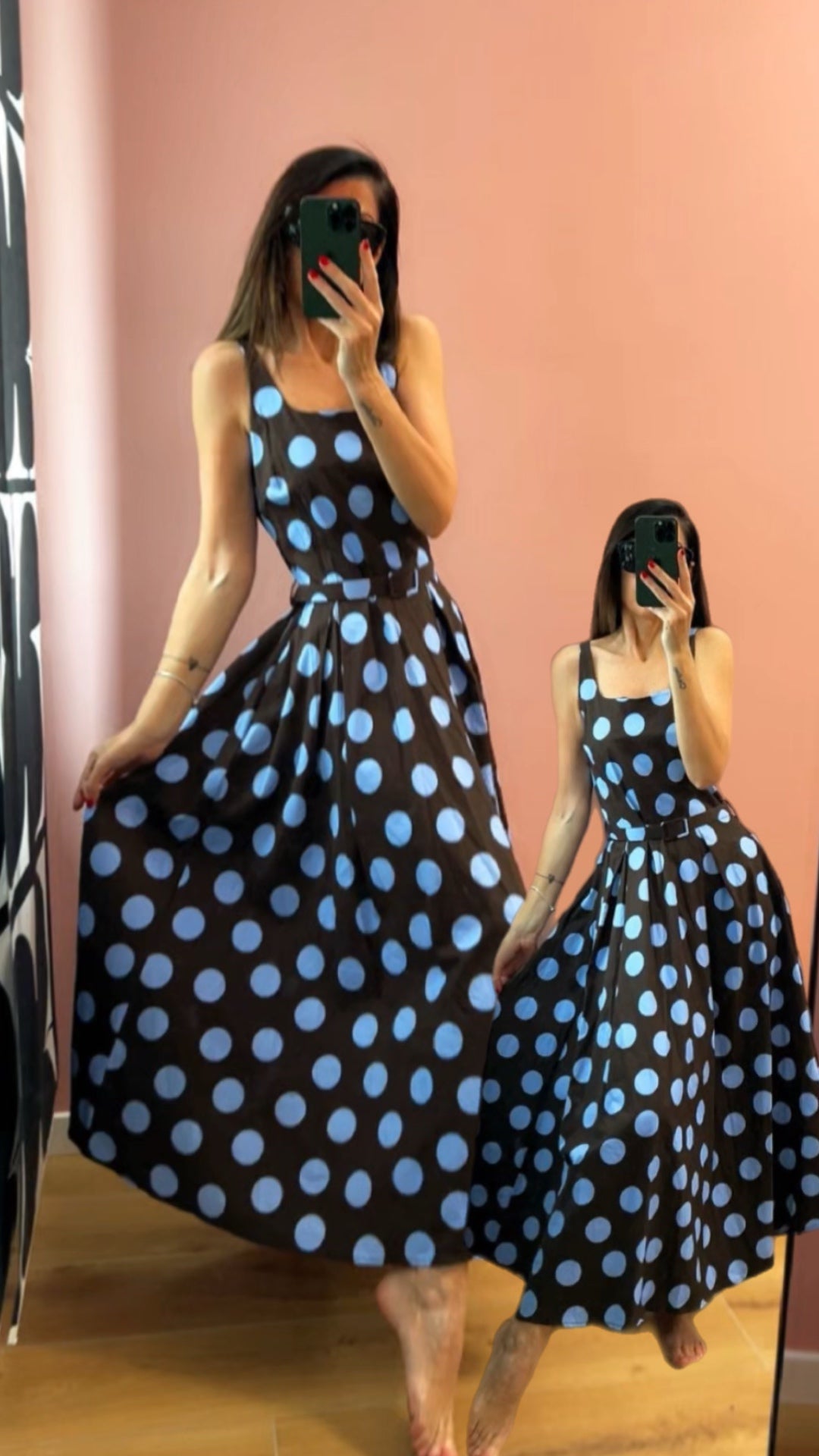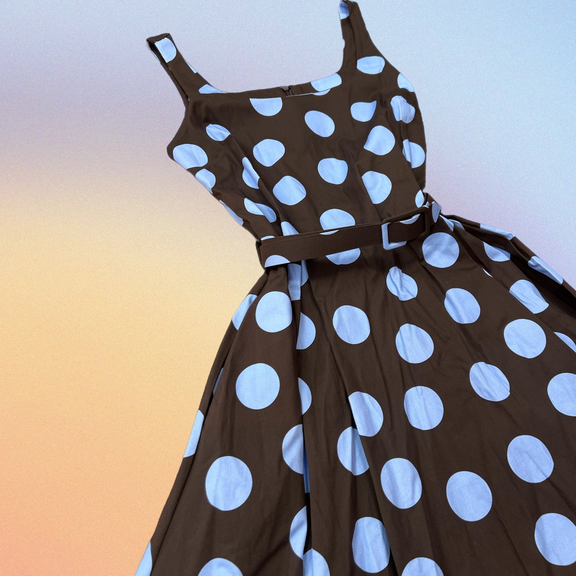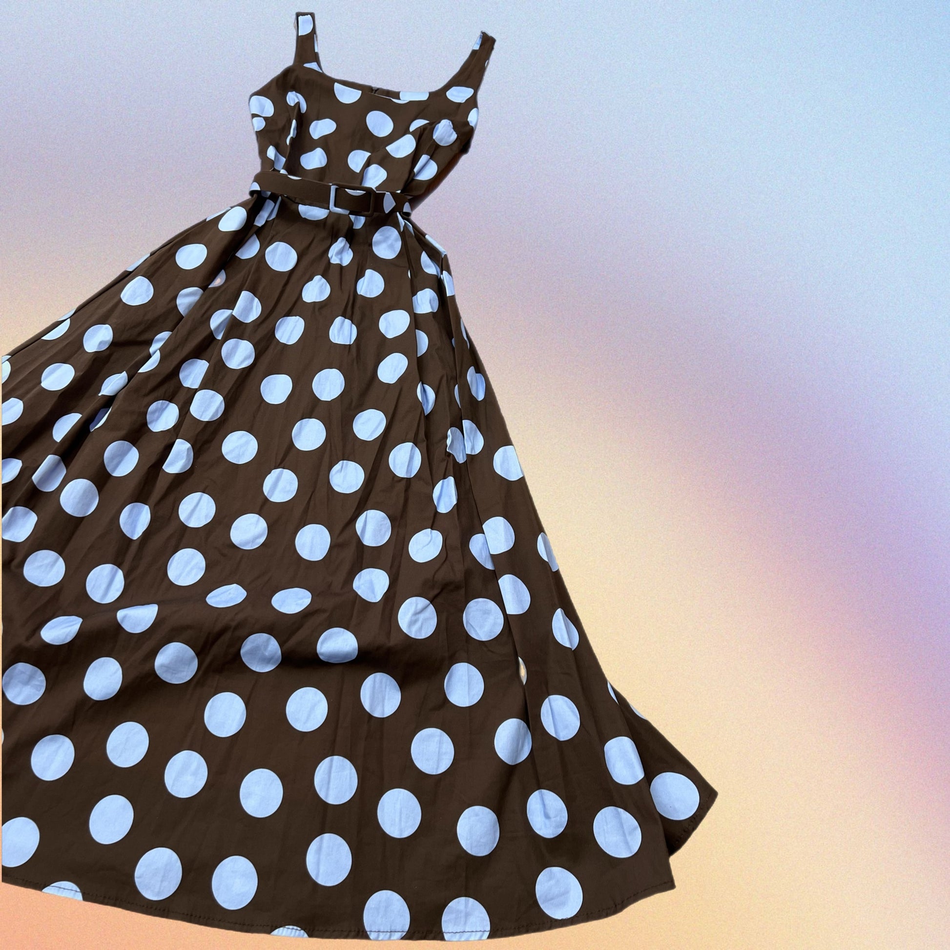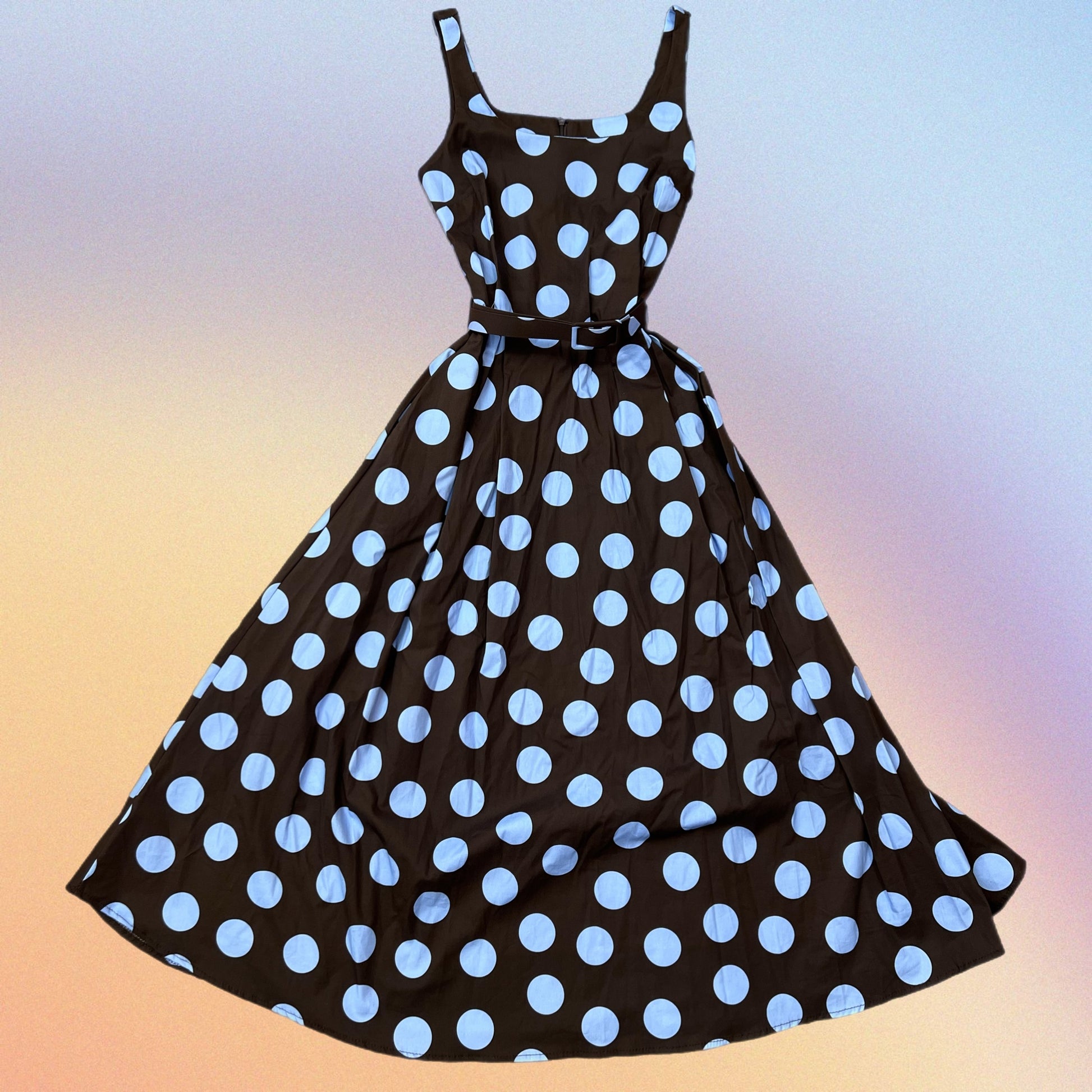 Abito midi a ruota con tasche. Scollatura quadrata. Cinturina tono su tono in tessuto. Estivo, Fresco, Sbarazzino, Chic. Fantasia POIS.