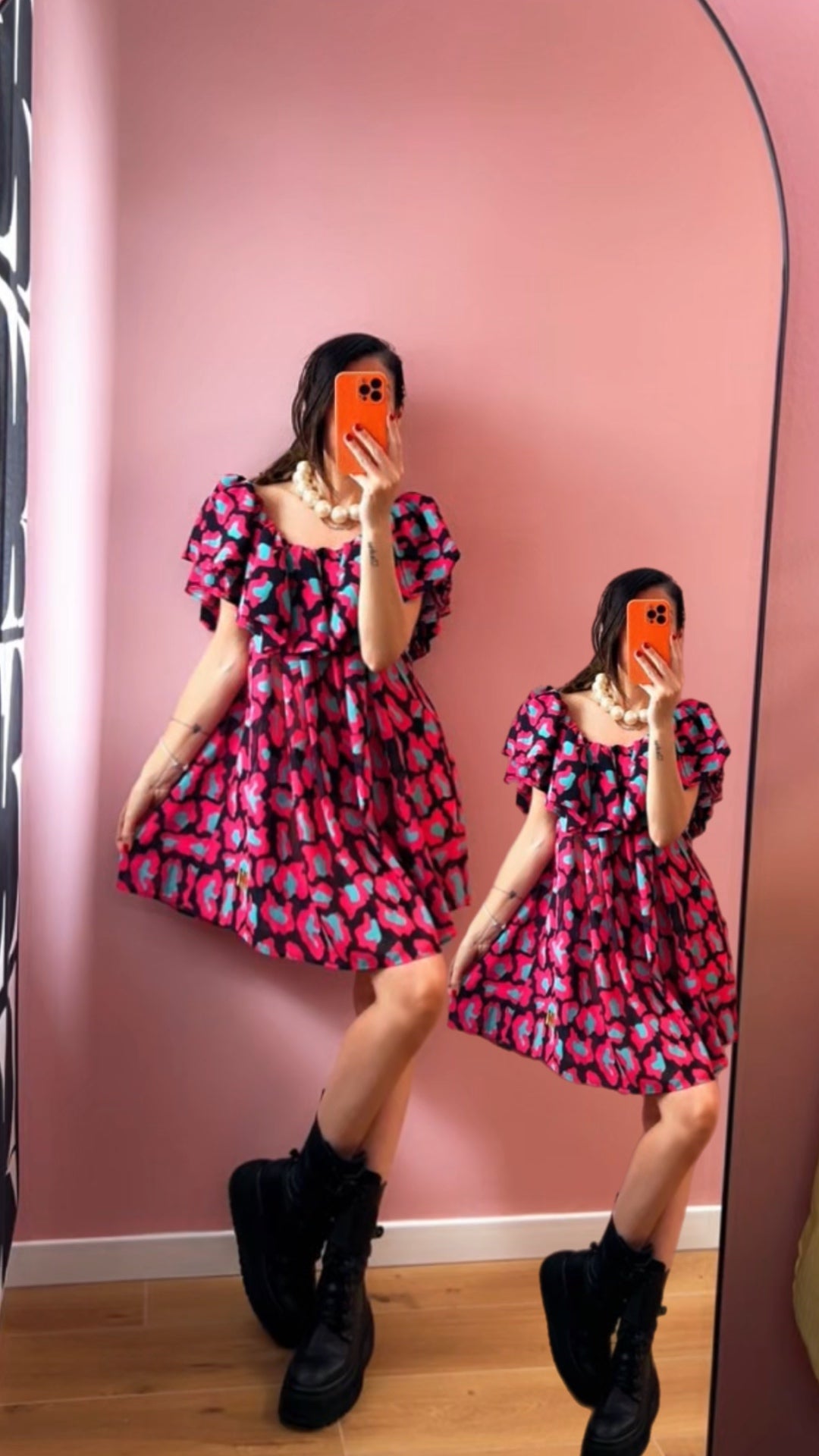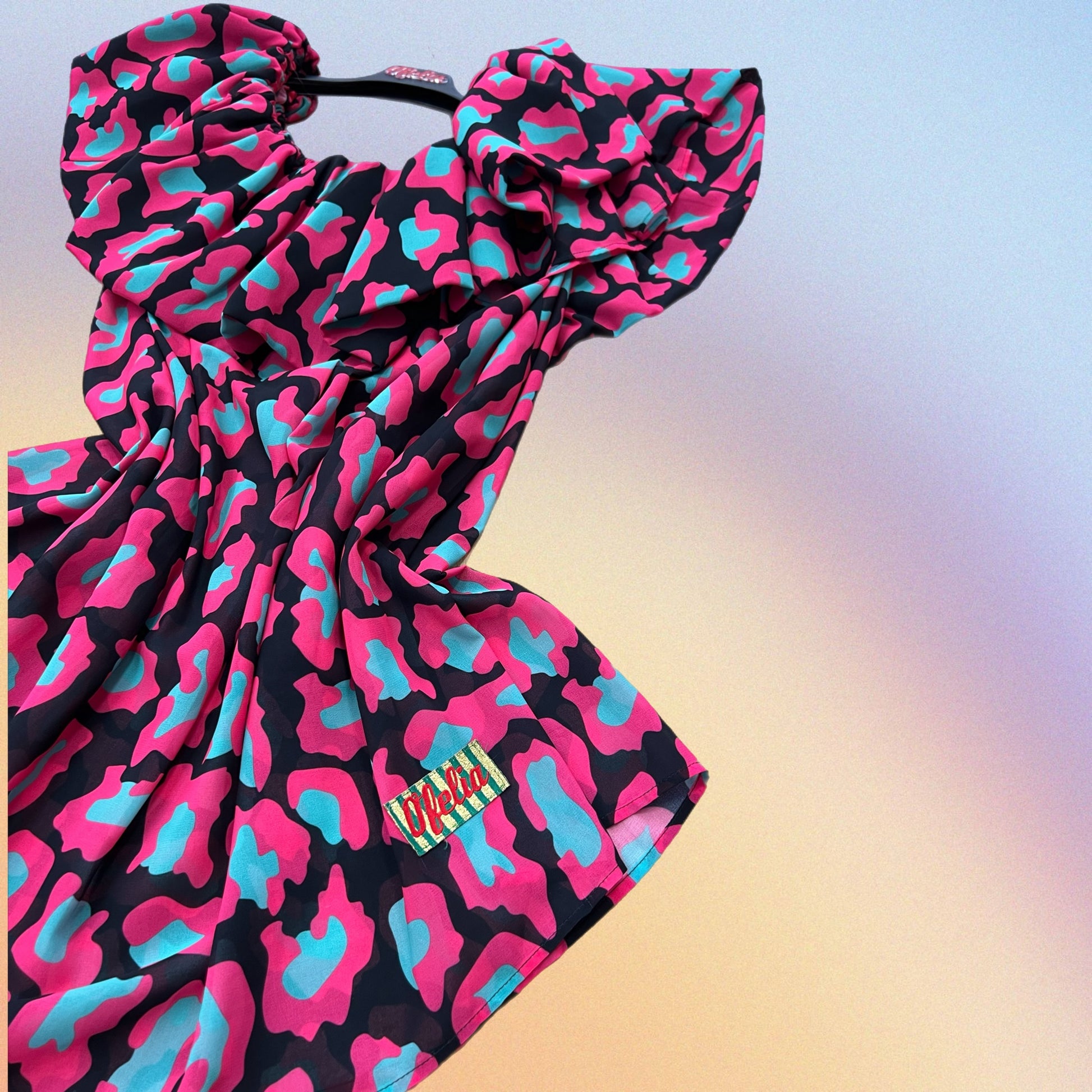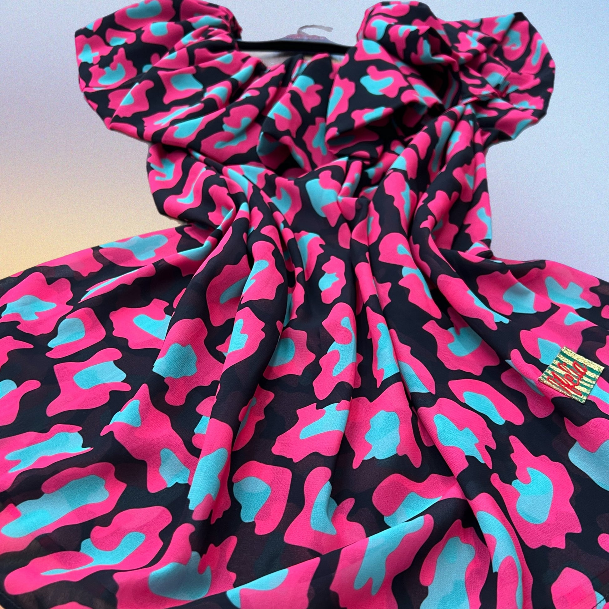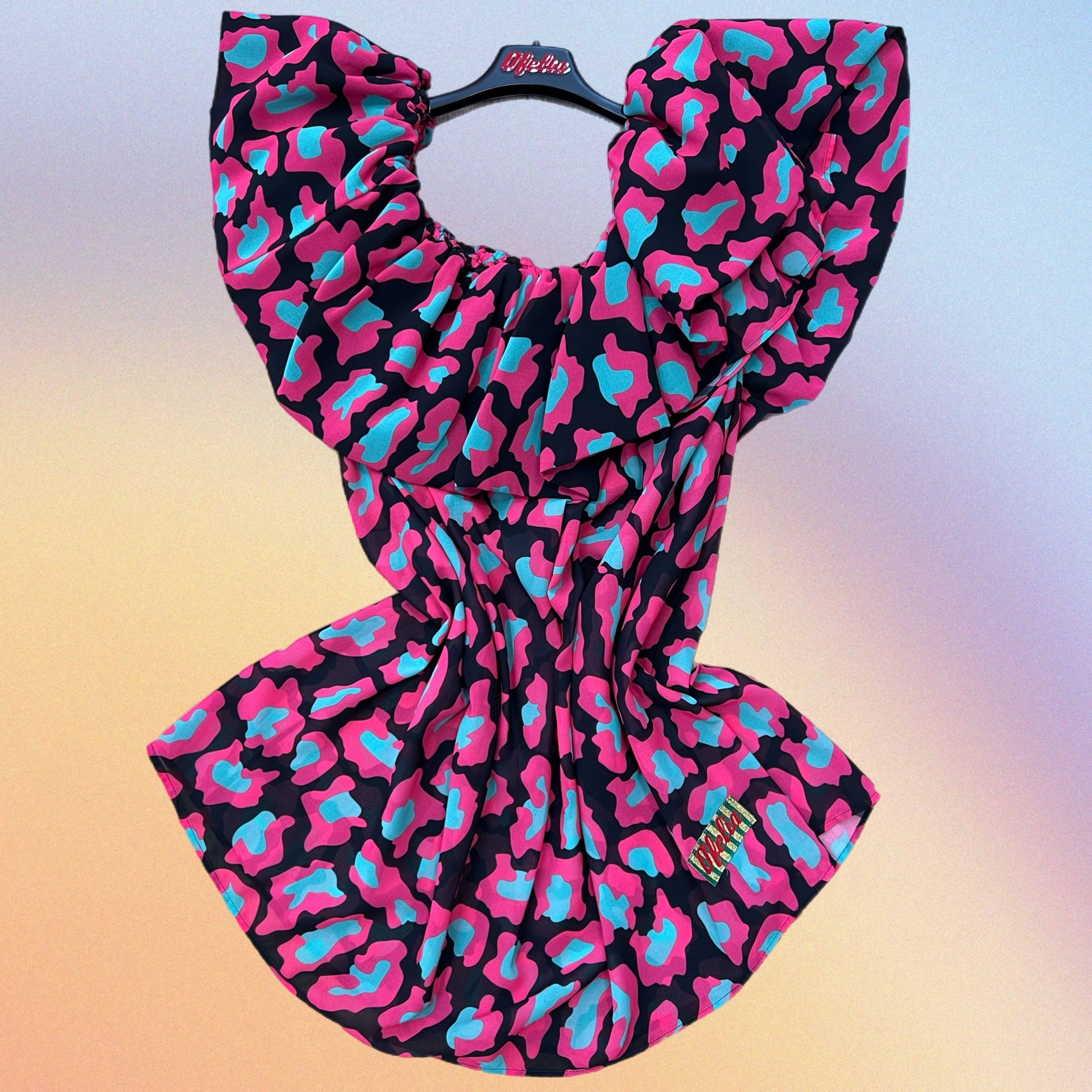 Abito in Chiffon con ampio volant. Scollo a barchetta con manichina incorporata. Fantasia animalier. Pezzo UNICO. Taglia UNICA
