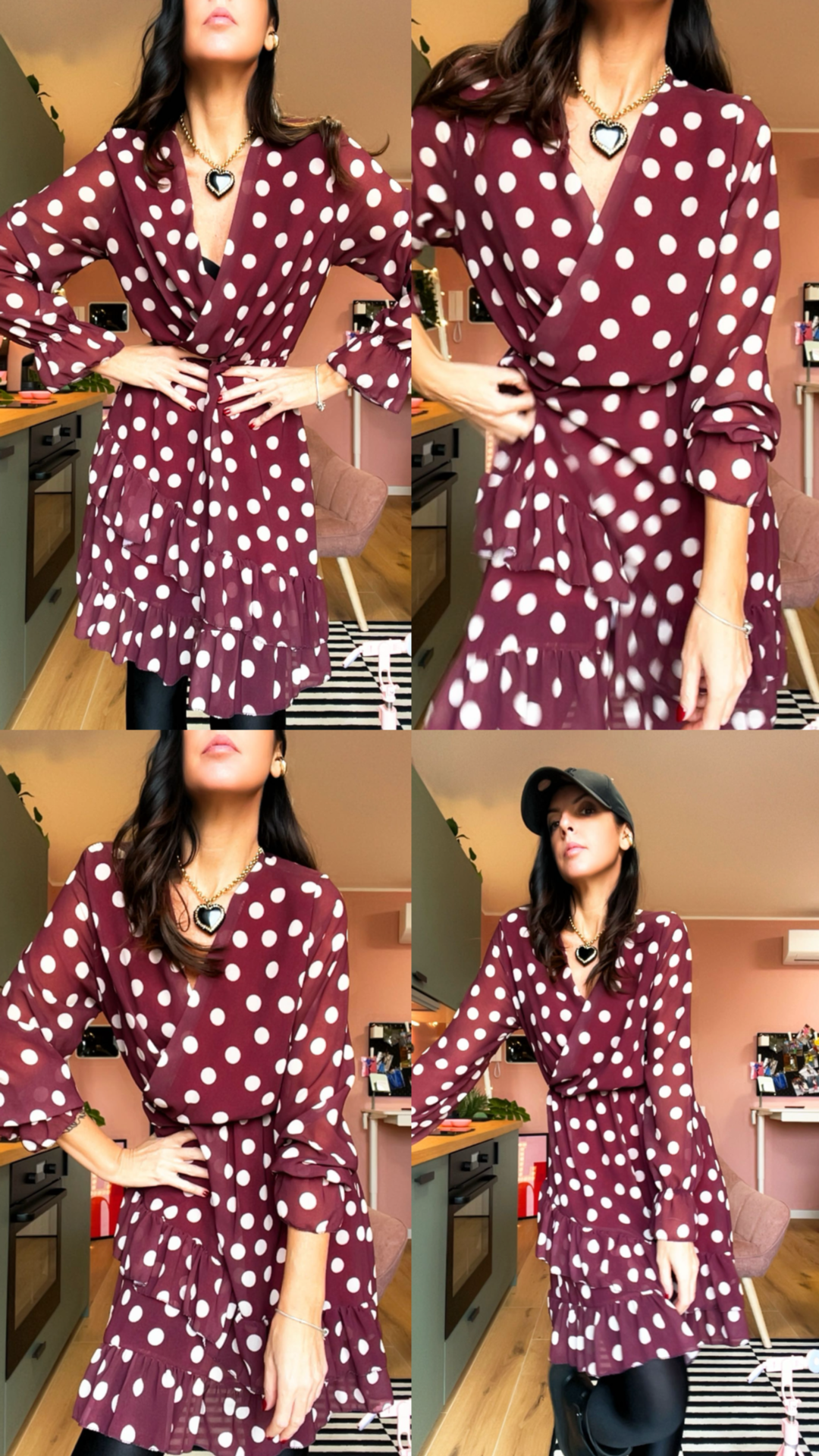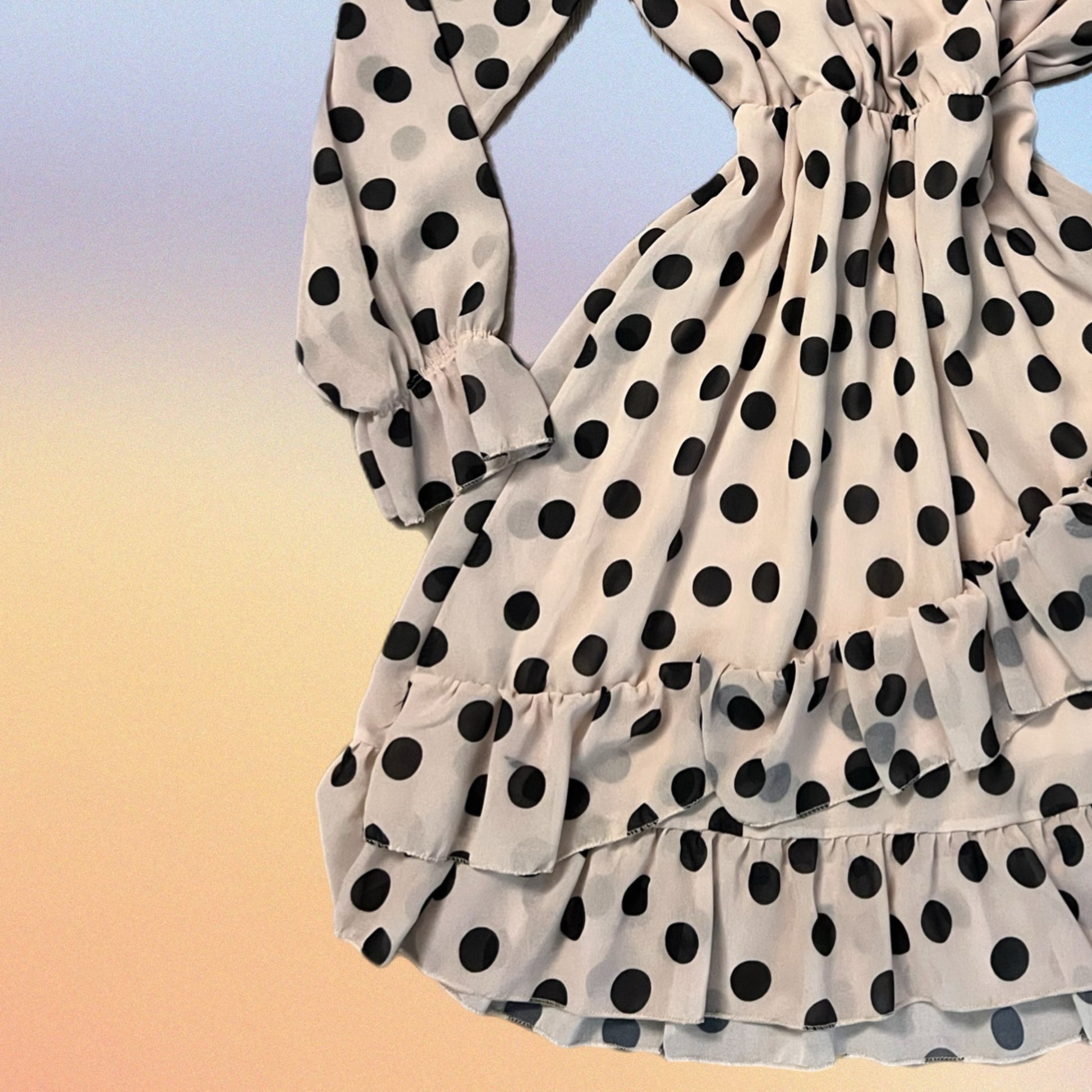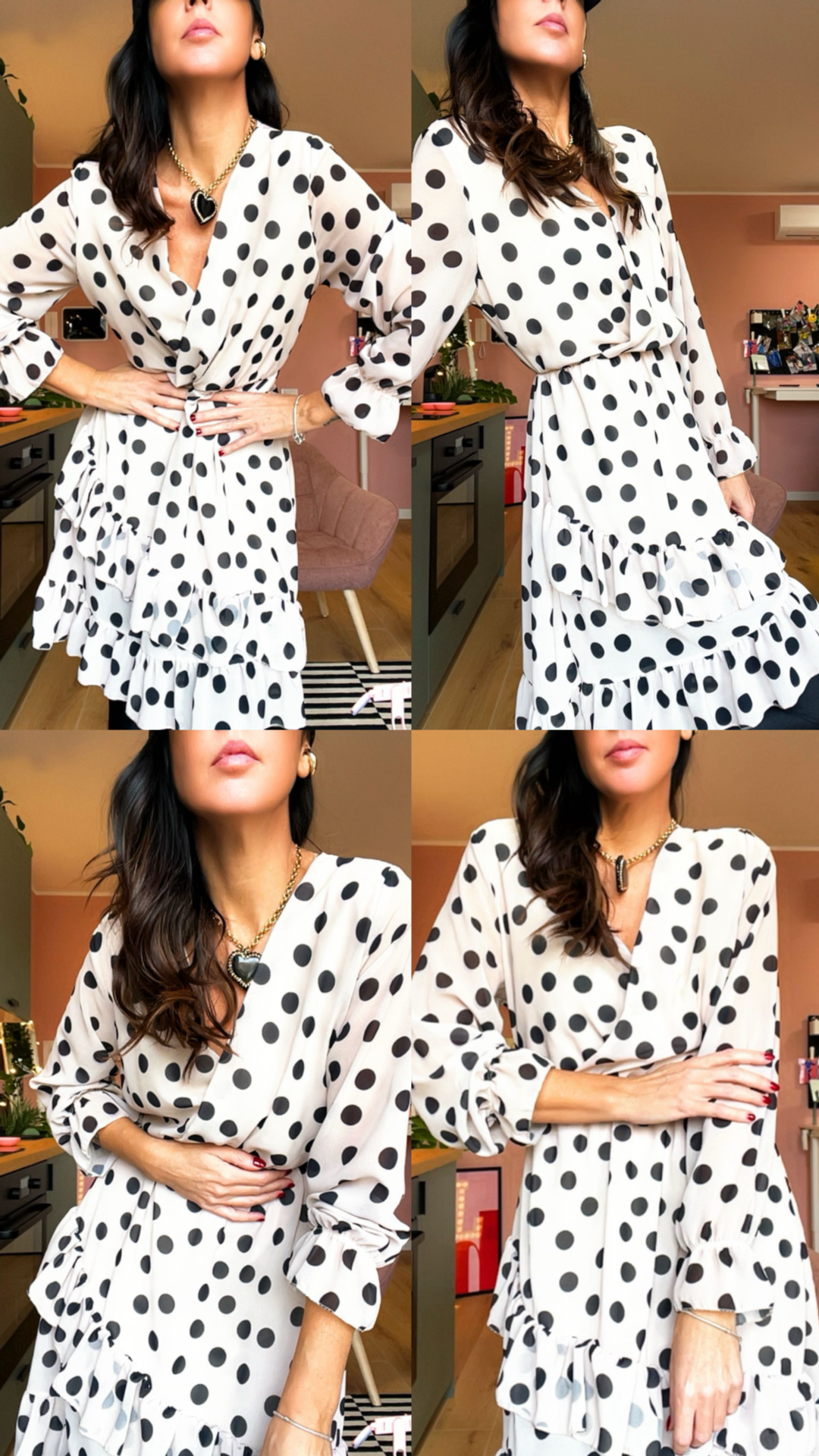 Abito in chiffon con scollo a V e balzette. Fantasia pois. Interamente foderato (no trasparenze).