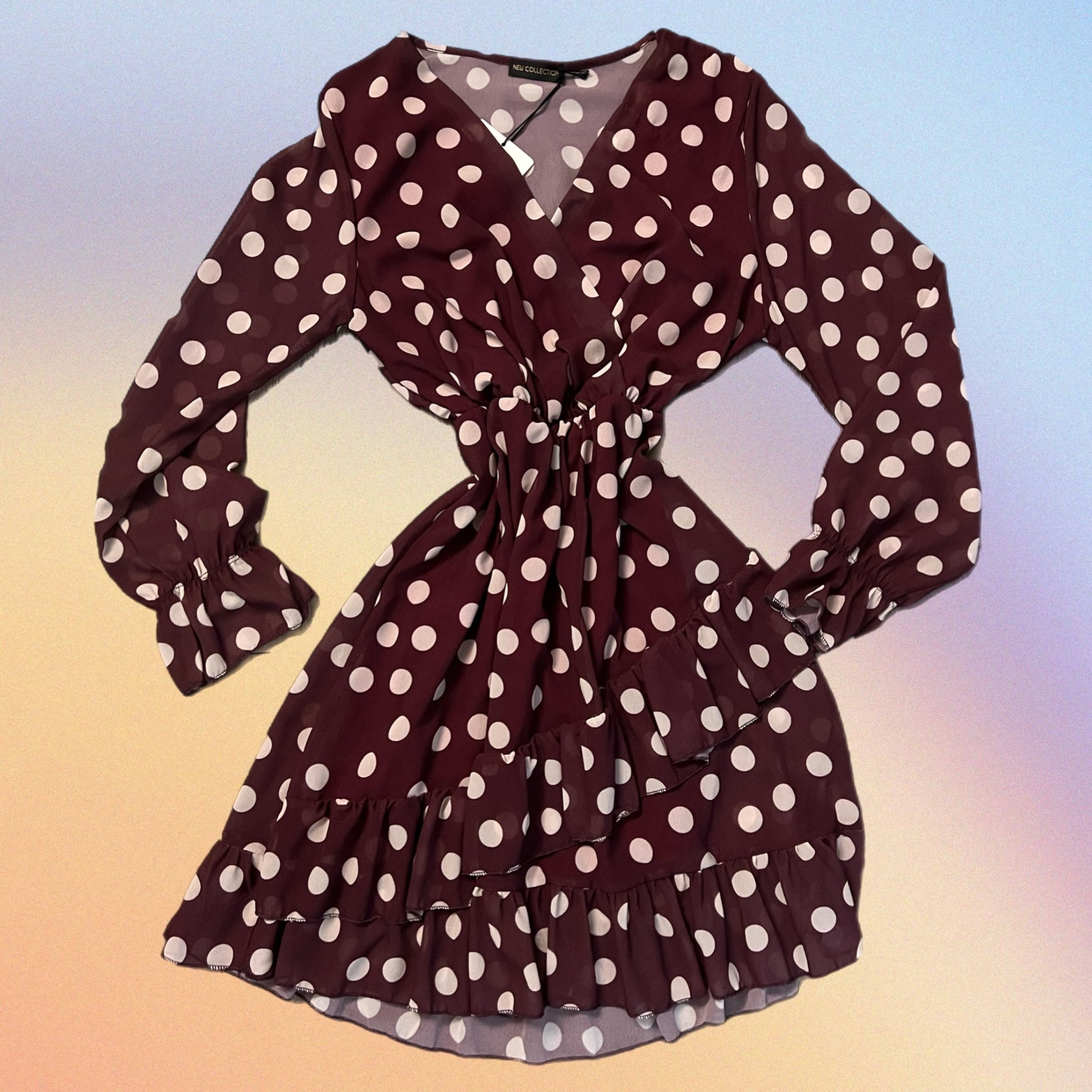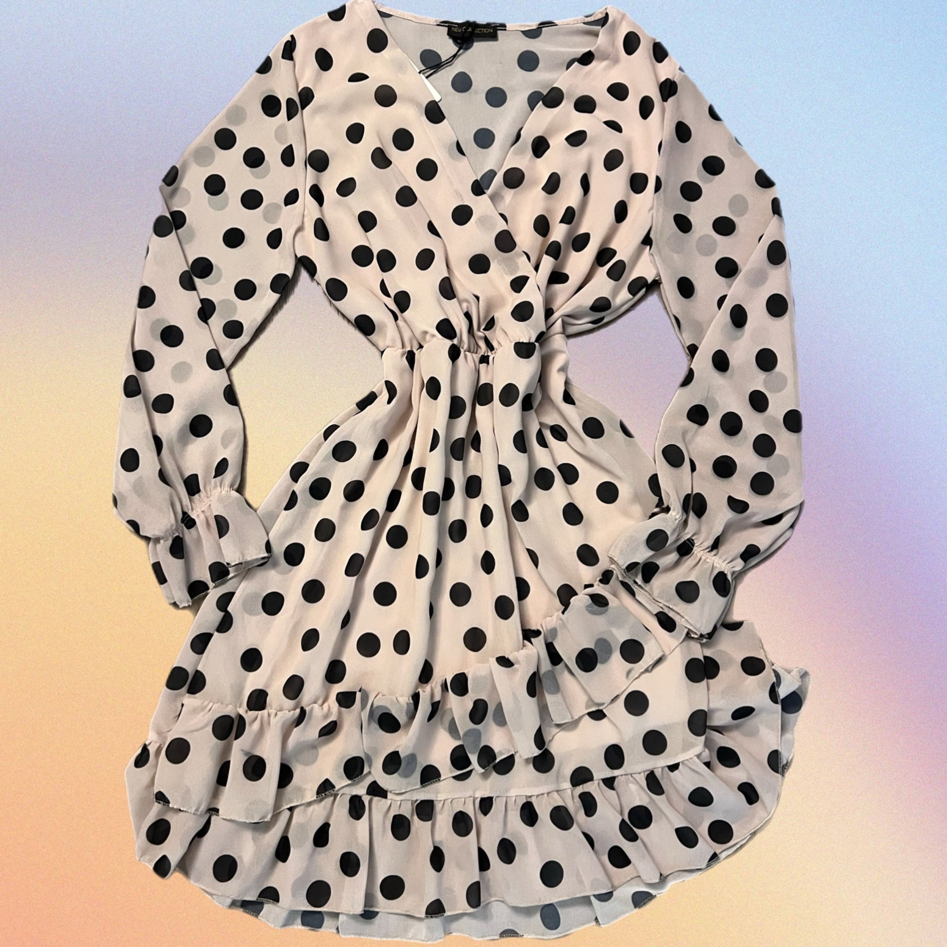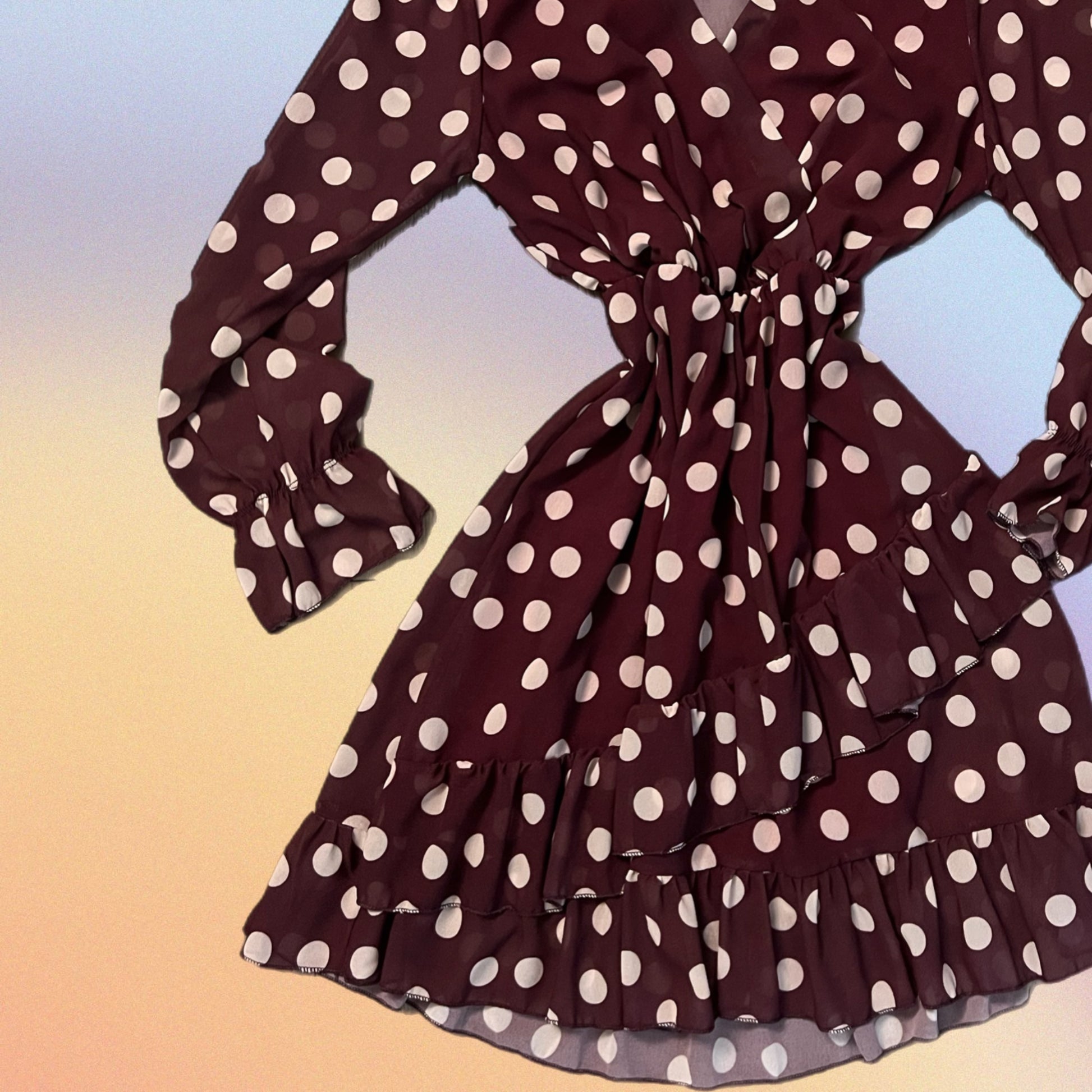 Abito in chiffon con scollo a V e balzette. Fantasia pois. Interamente foderato (no trasparenze).