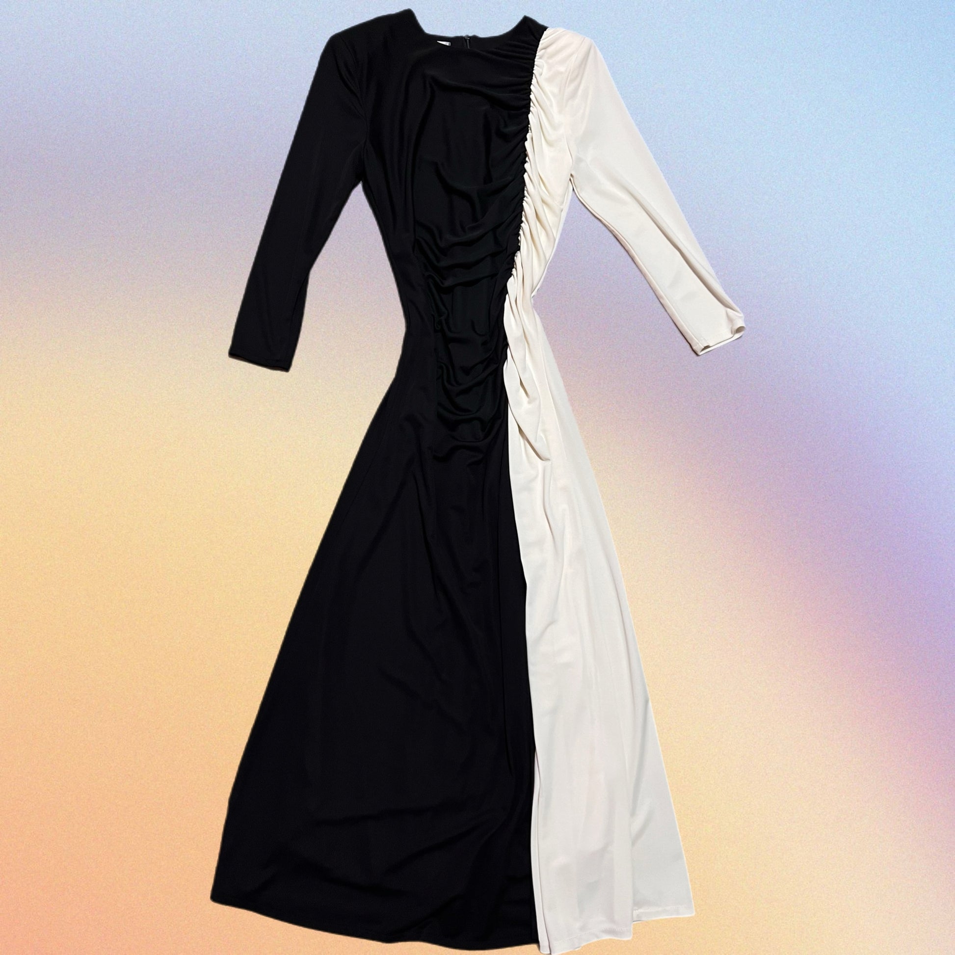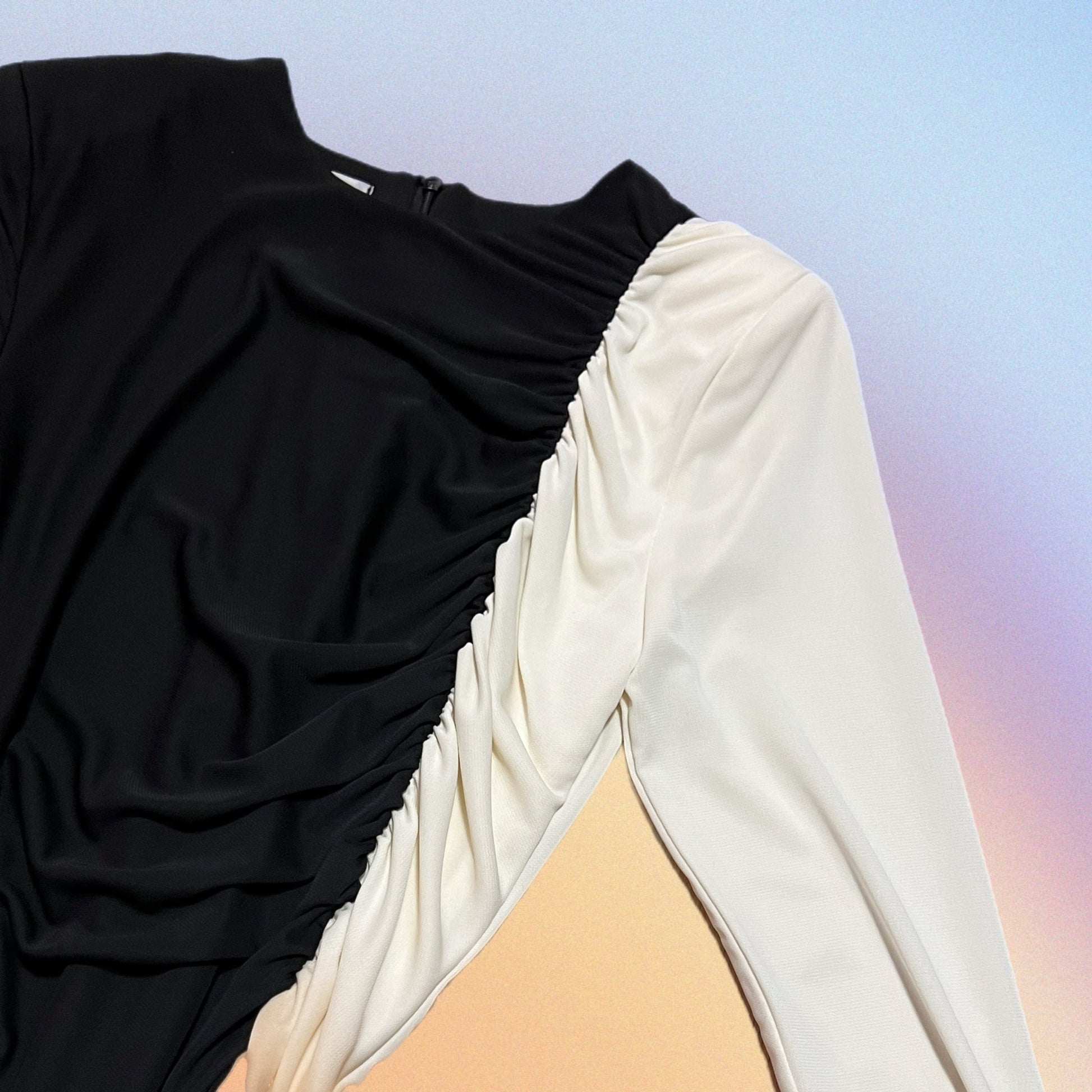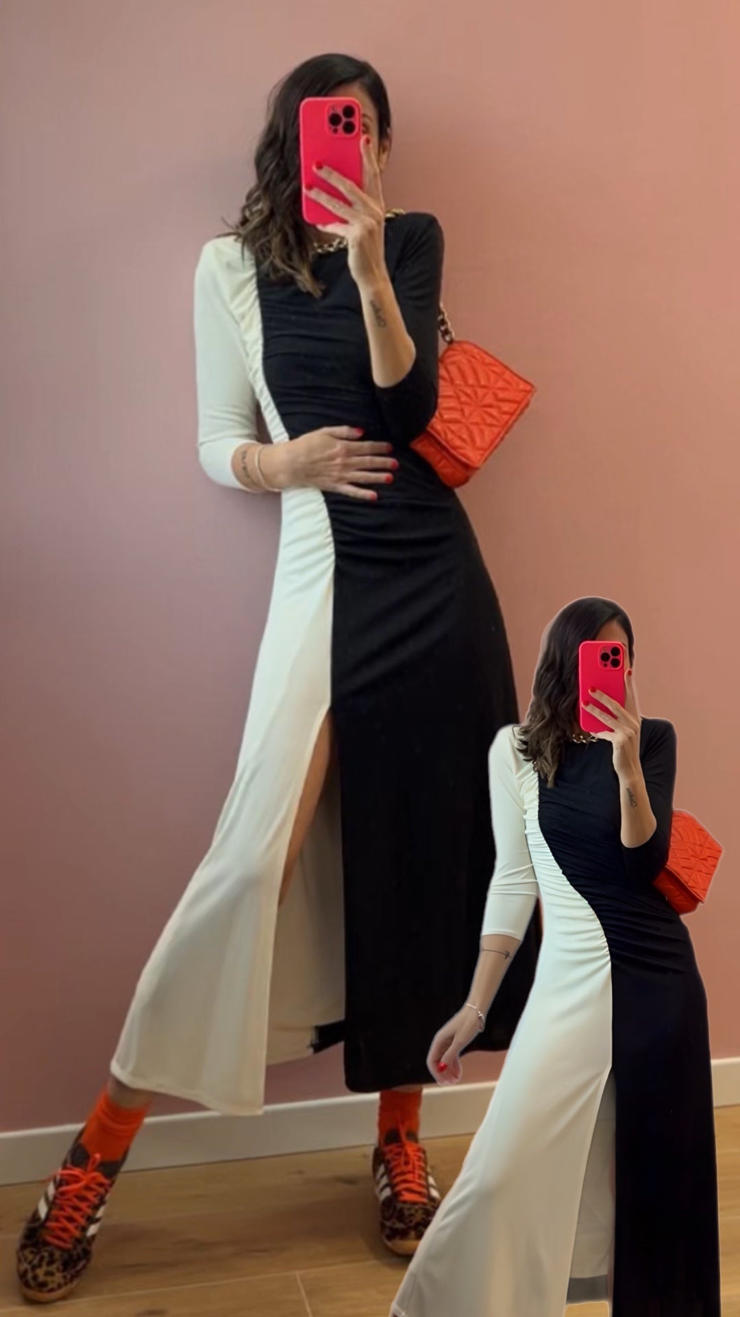 Abito drappeggiato con spacco color block Black&White. Con Fodera. Spallina rinforzata .No trasparenze. Manica a 3/4. Ultra Chic.