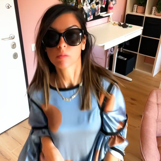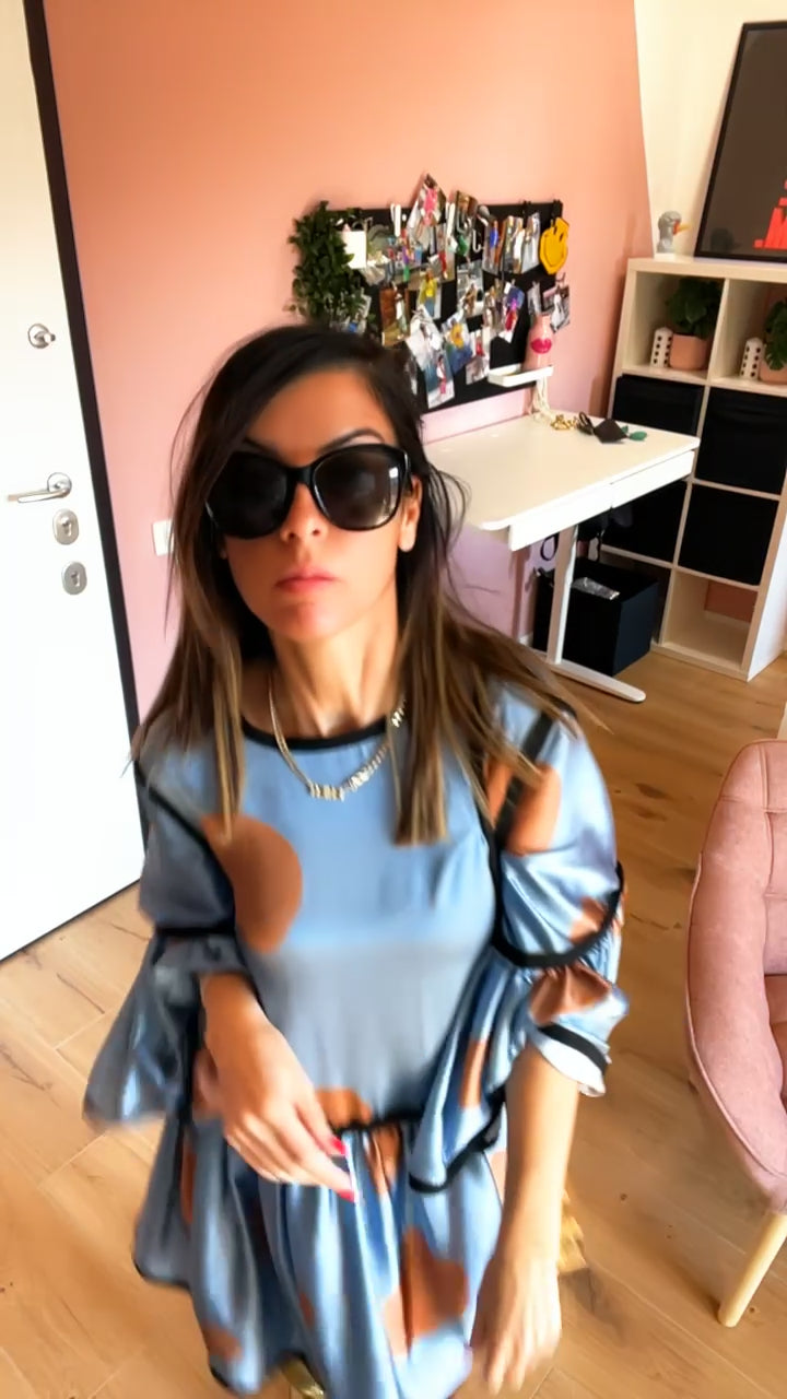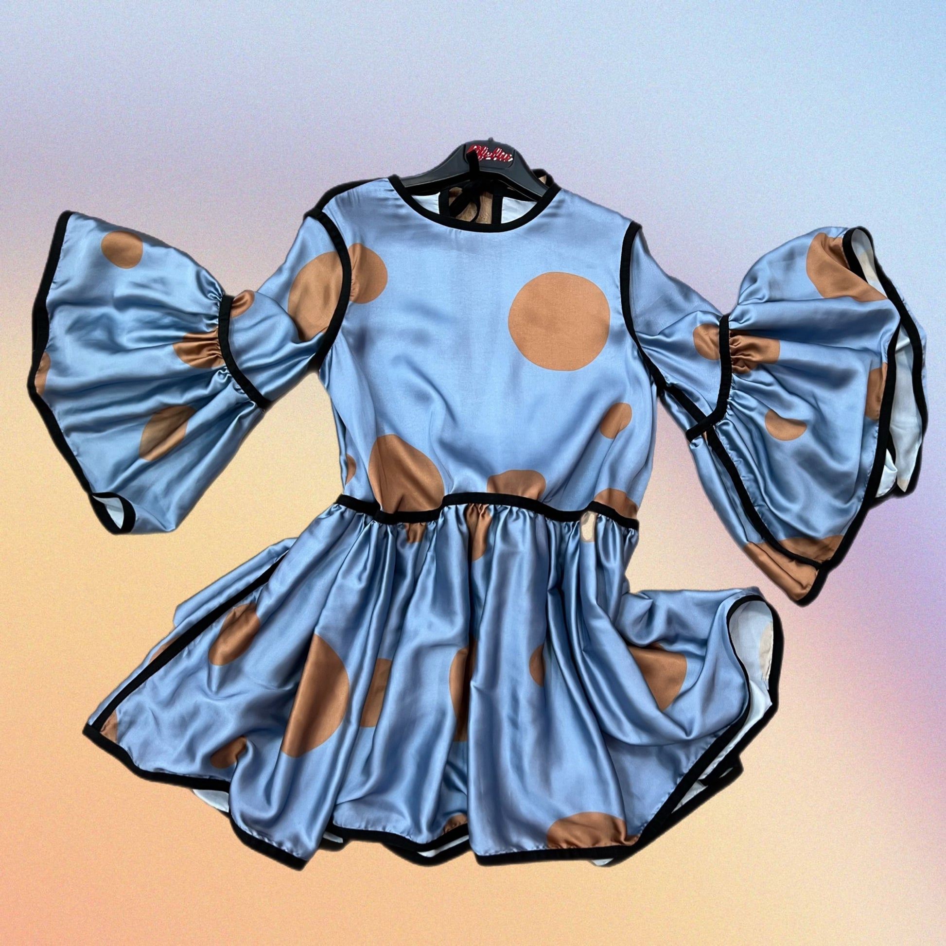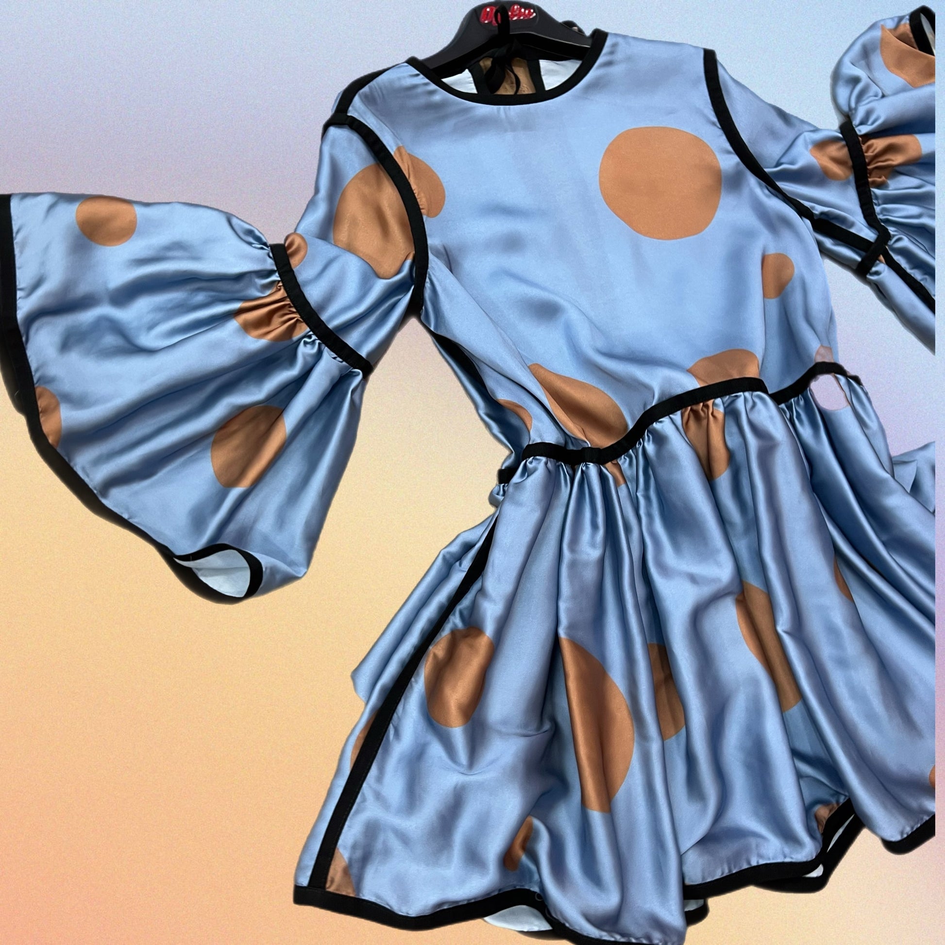 Abito in satin fantasia pois interamente profilato in gros grain nero. Manica a 3/4. Chiusura a goccia sulla schiena. Pezzo Unico. Taglia Unica.
