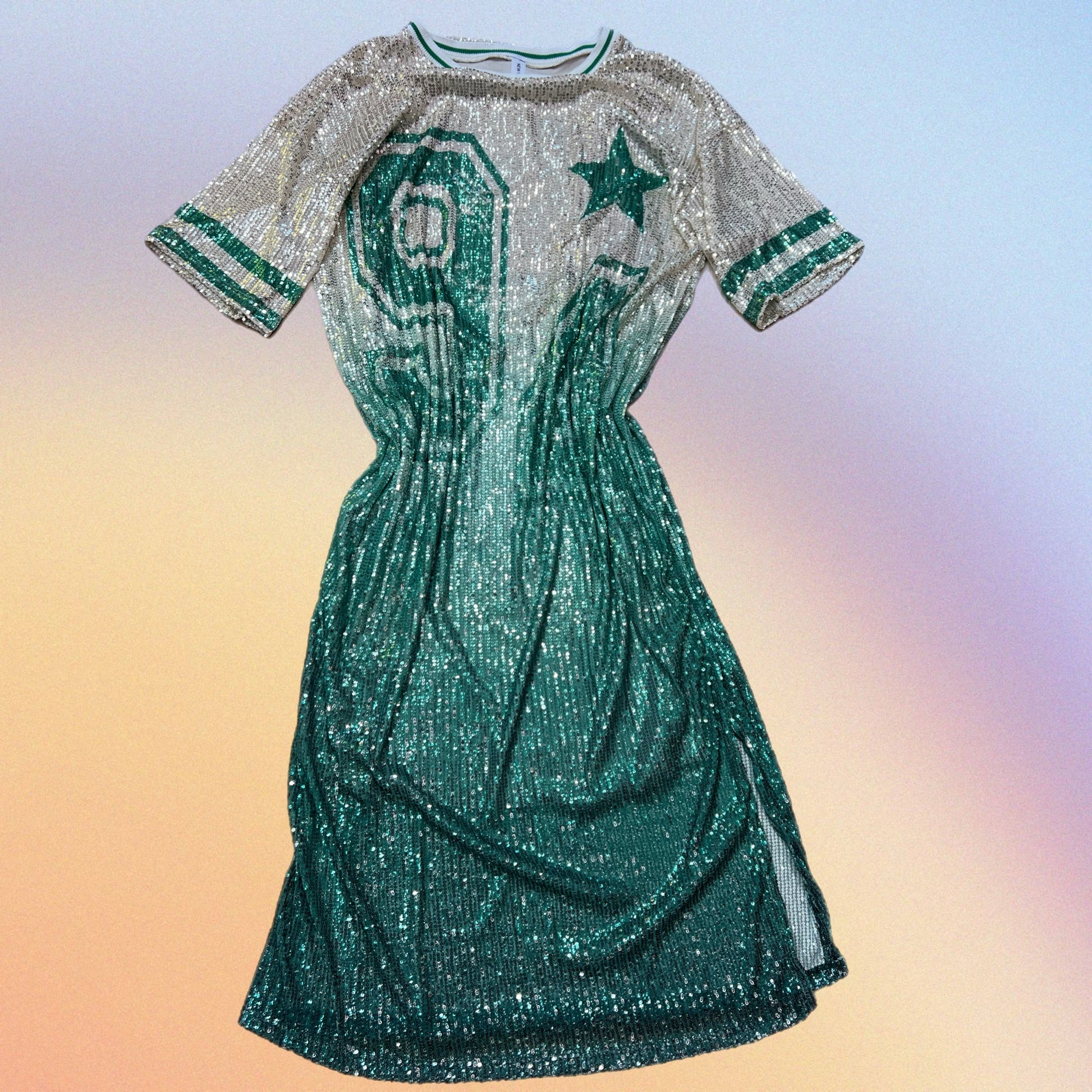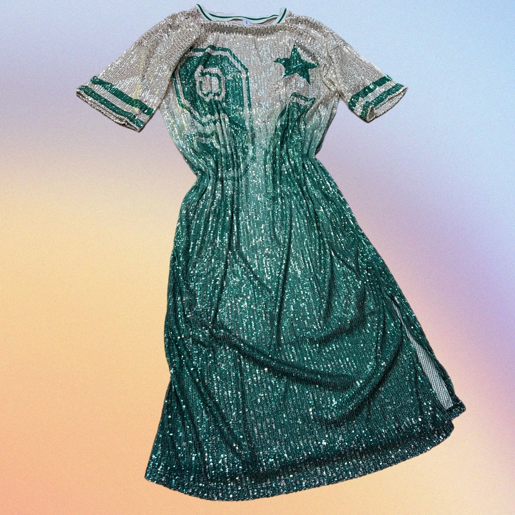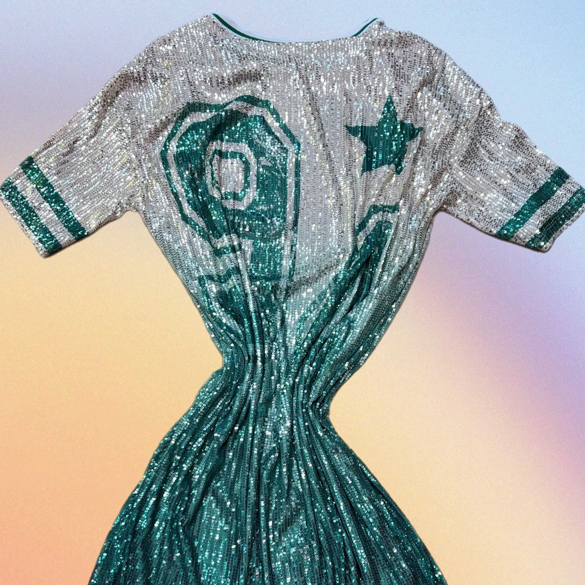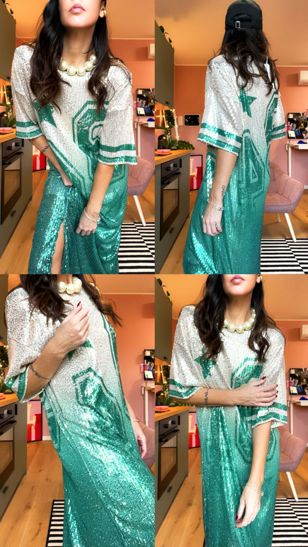 Abito in pailette con sottoveste in jersey elasticizzato. Grafica 9 maxi e stella.
