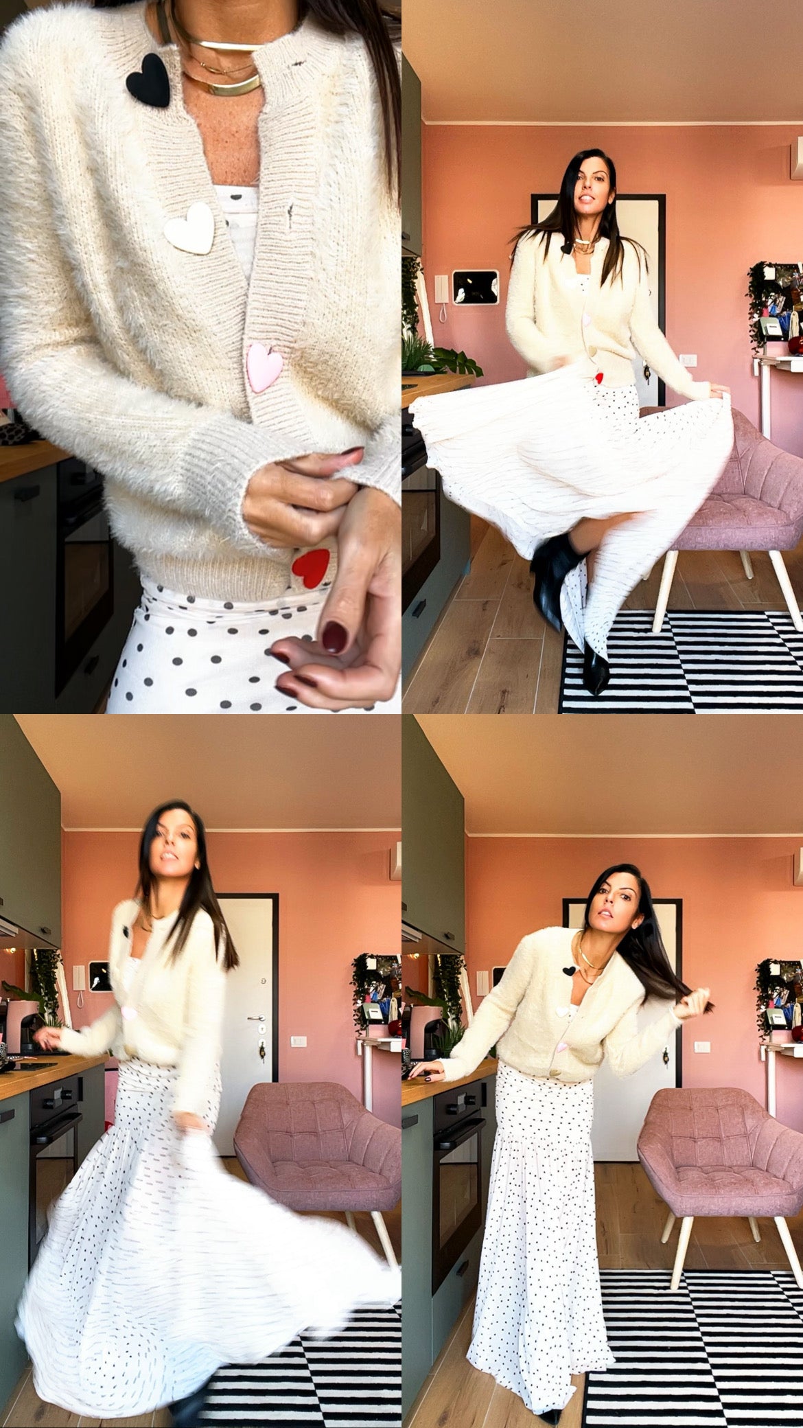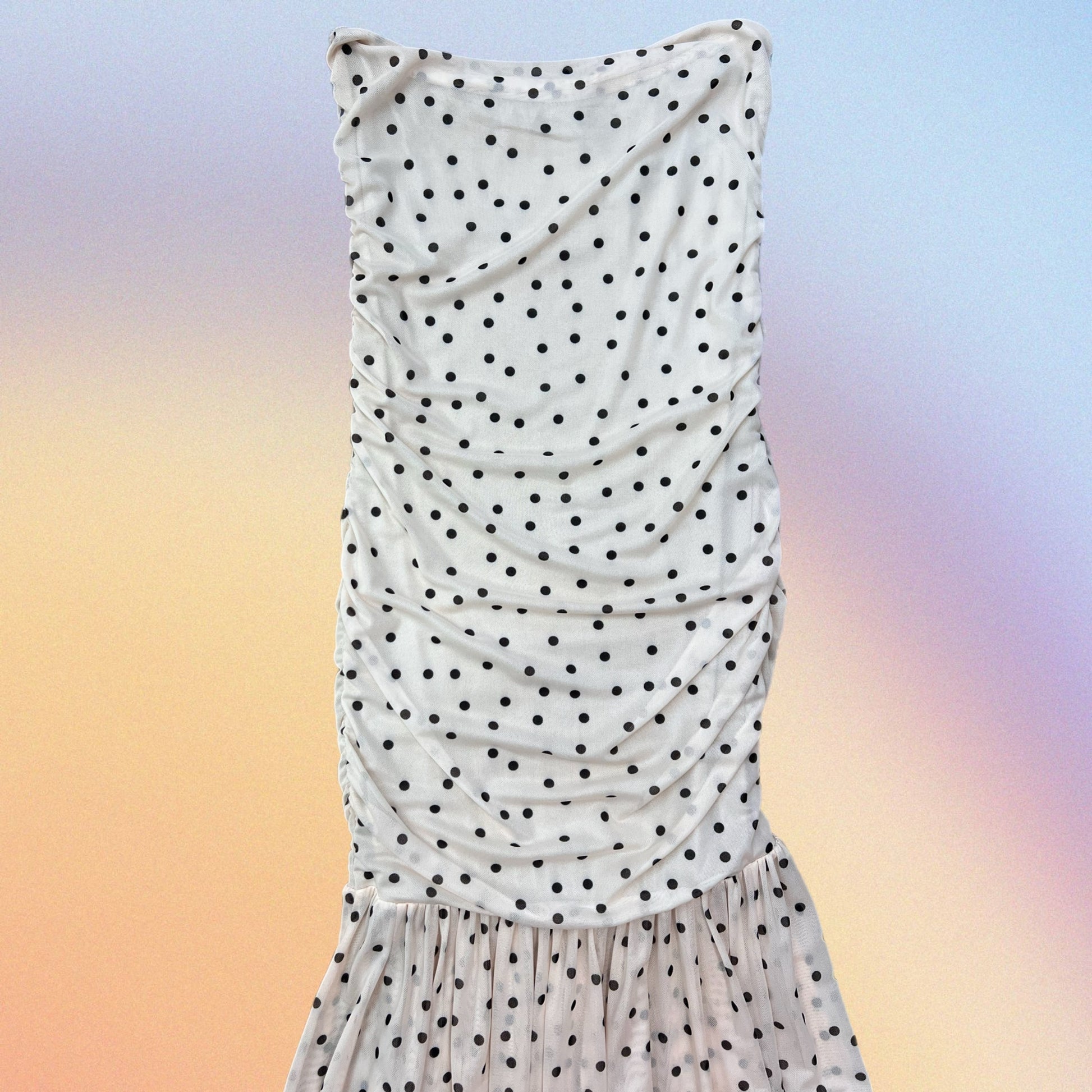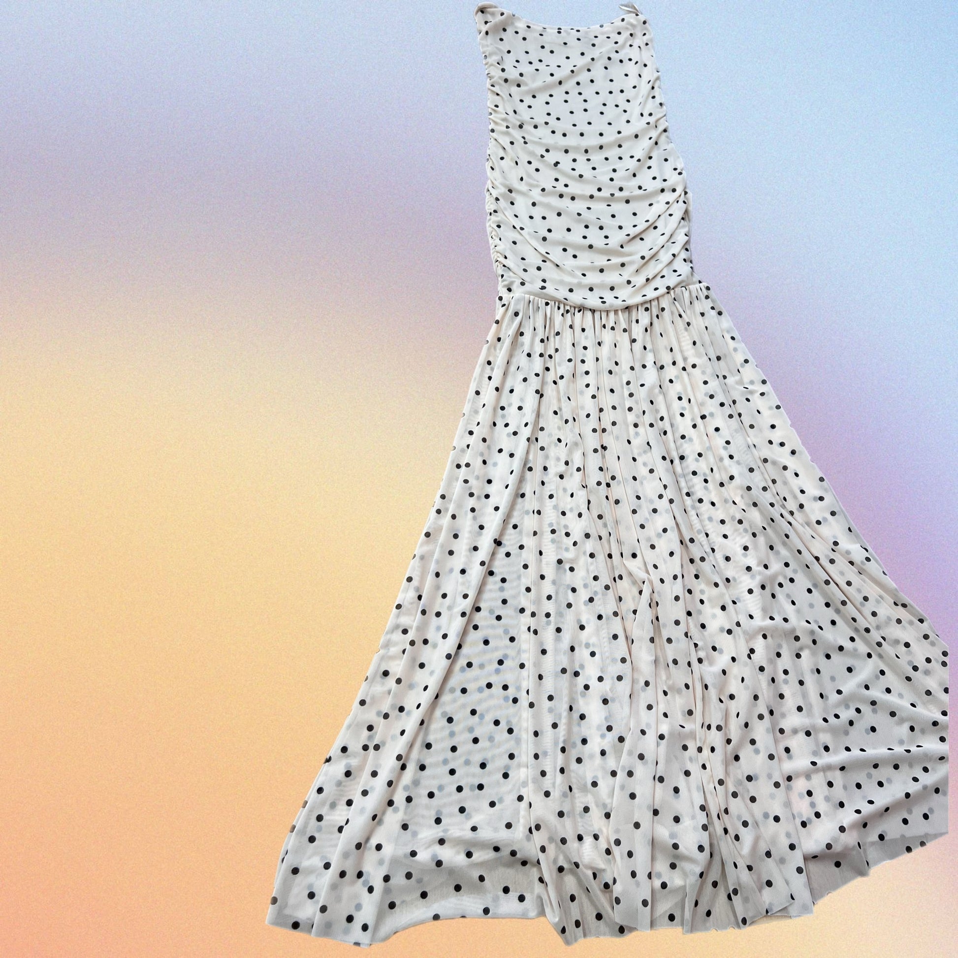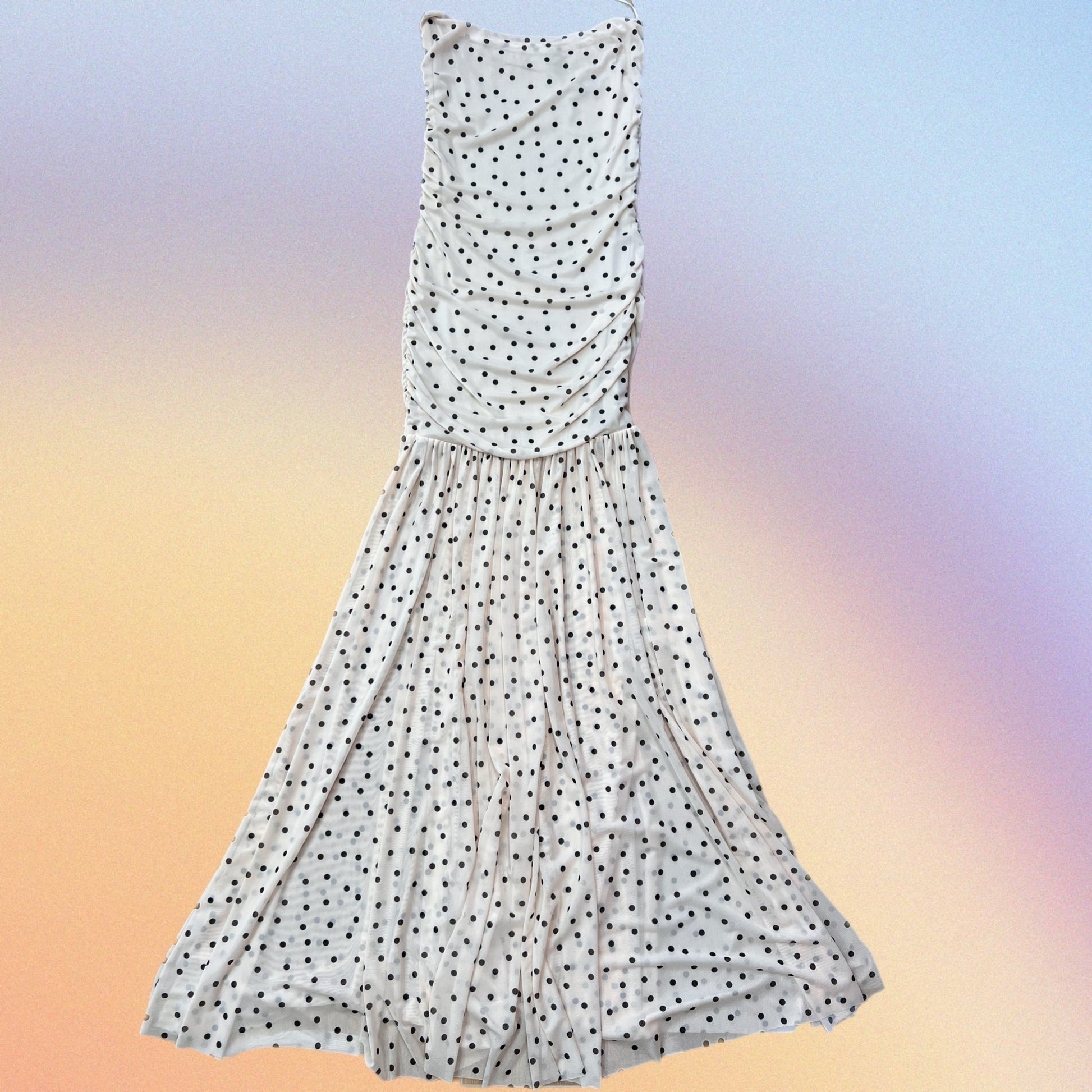 Abito tubino arricciato con gonna svasata. Color crema con piccoli pois a contrasto neri.