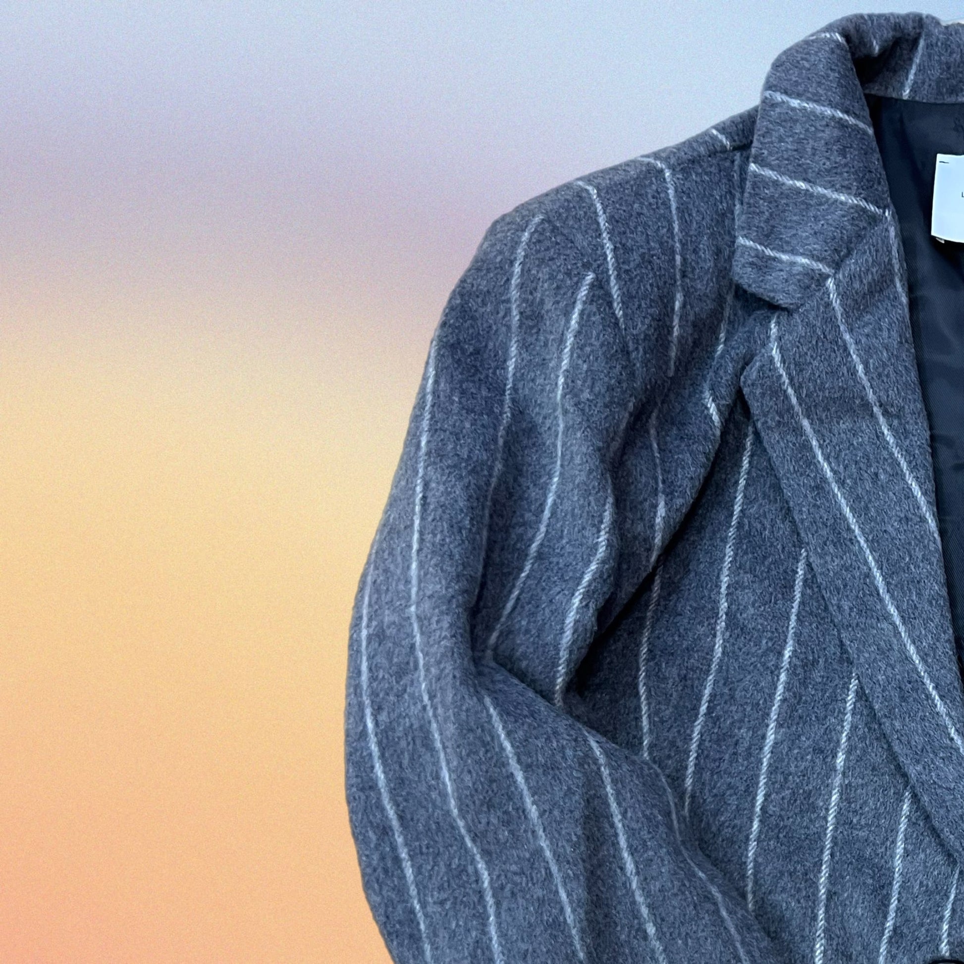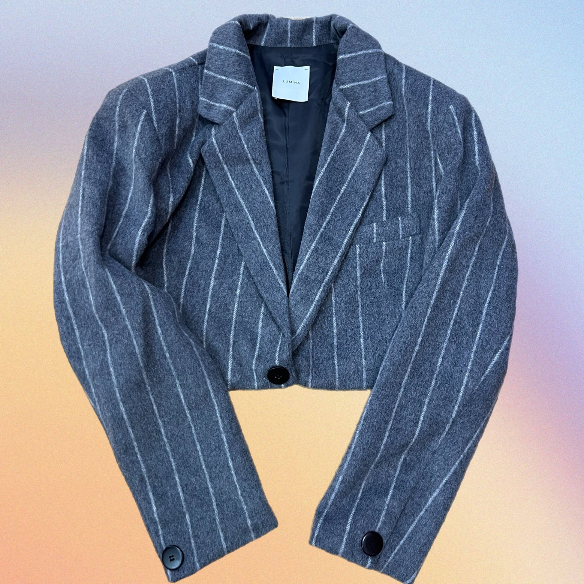 Blazer crop in lana gessato con un bottone. Lunghezza busto: 40cm