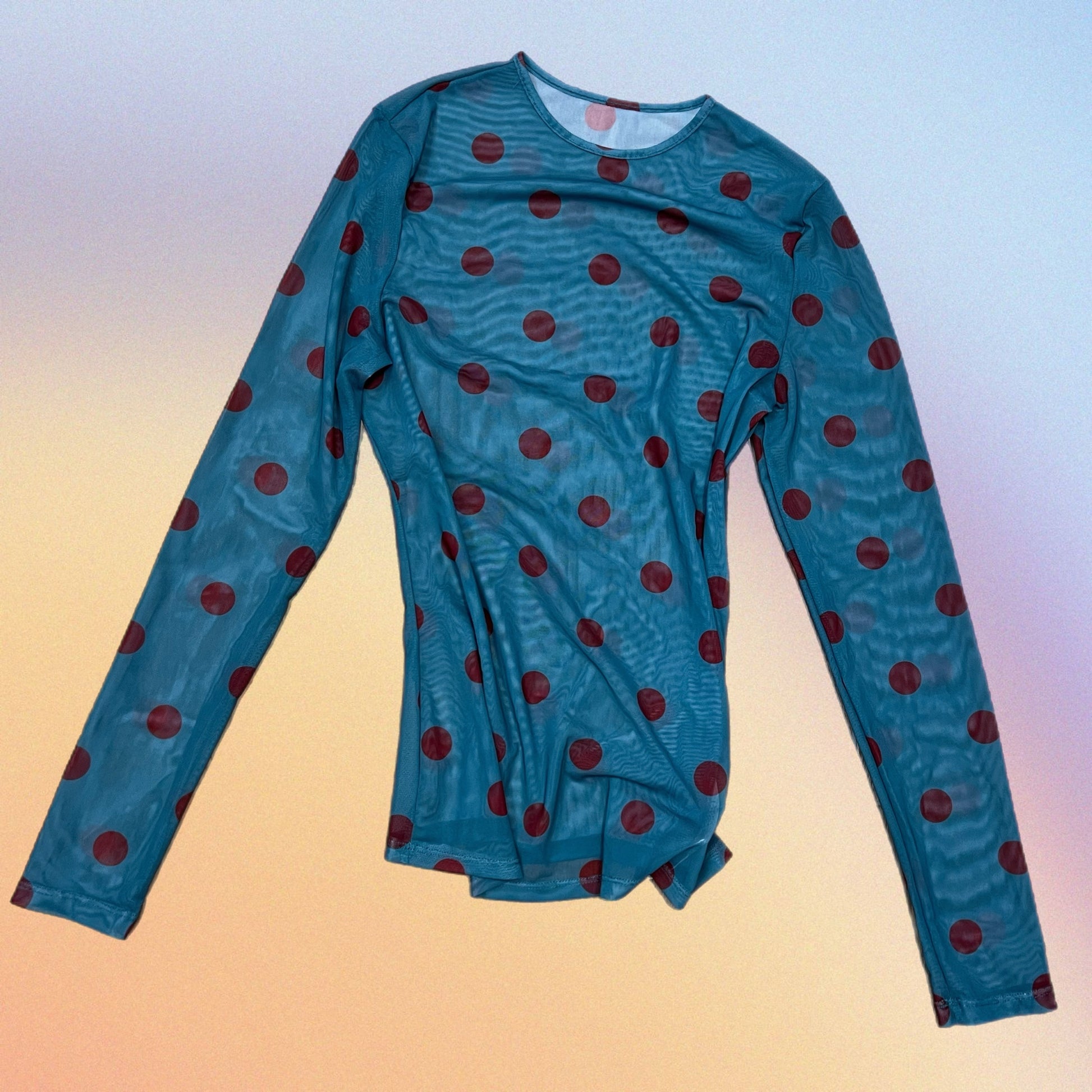 Blusetta in tulle elasticizzato base ottanio con pois grandi rossi. Taglia Unica.