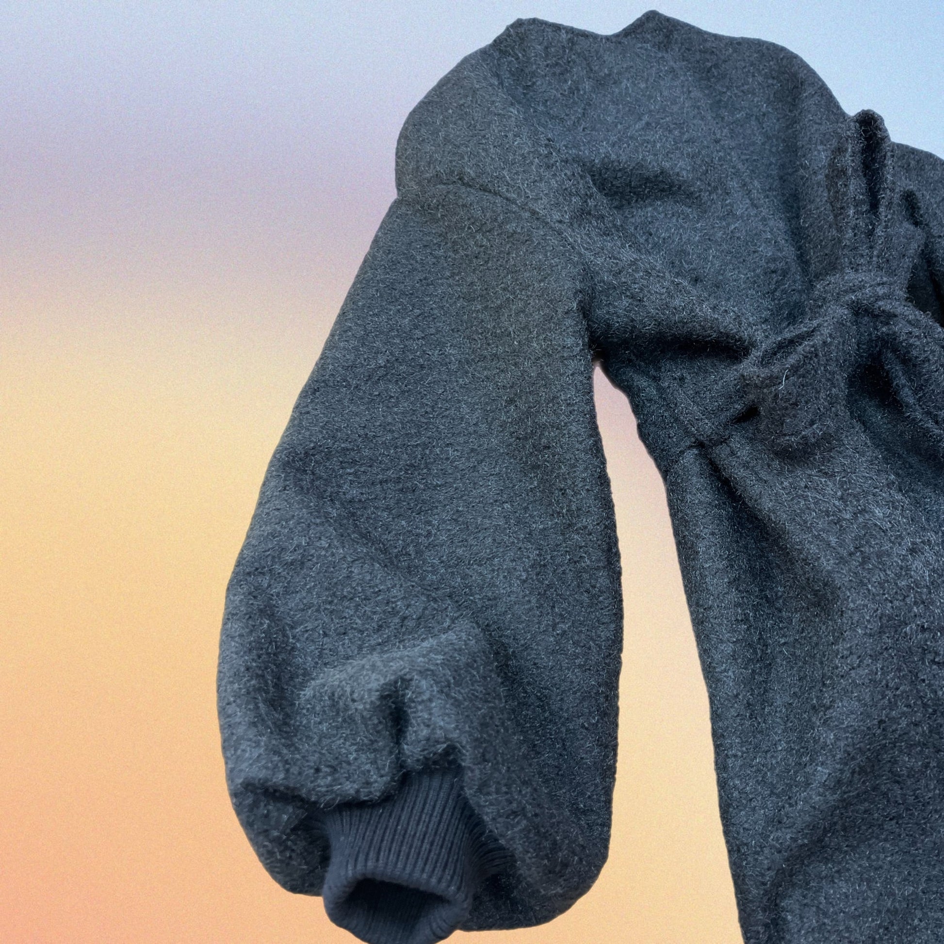 Cappotto in lana cotta con manica a goccia. Polsino a costine. Chiusura con bottoni a pressione e fusciacca in vita.