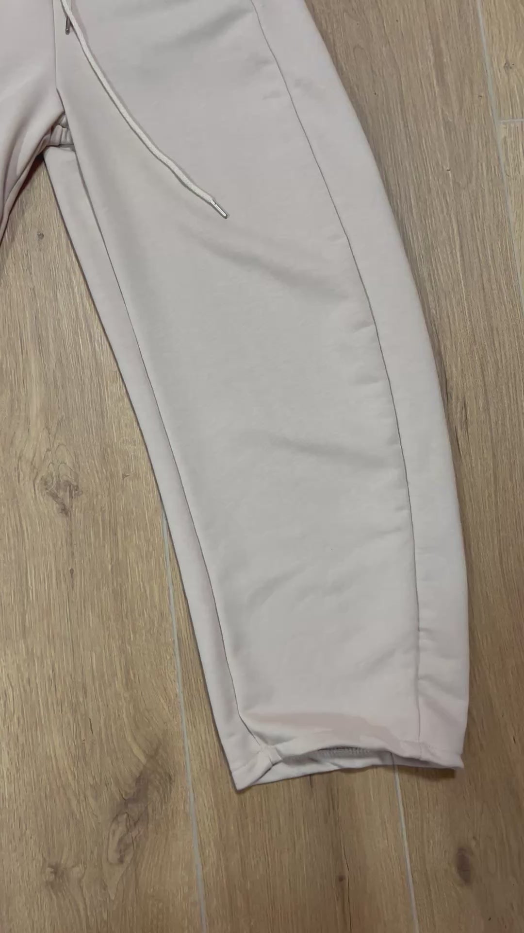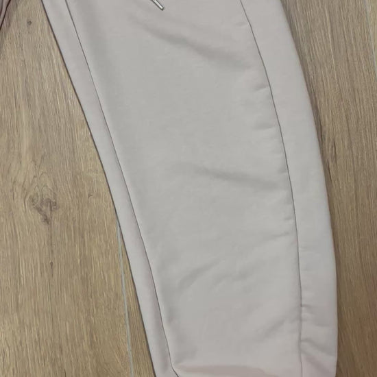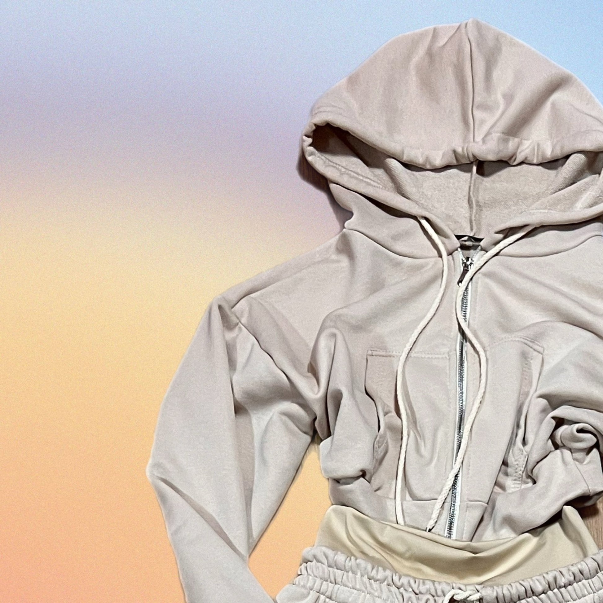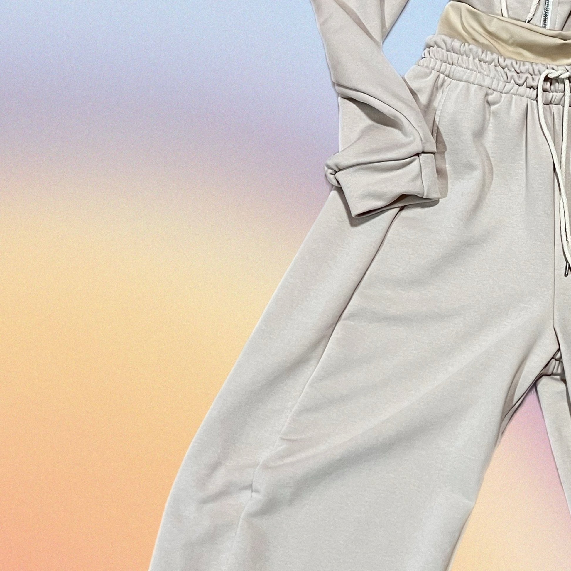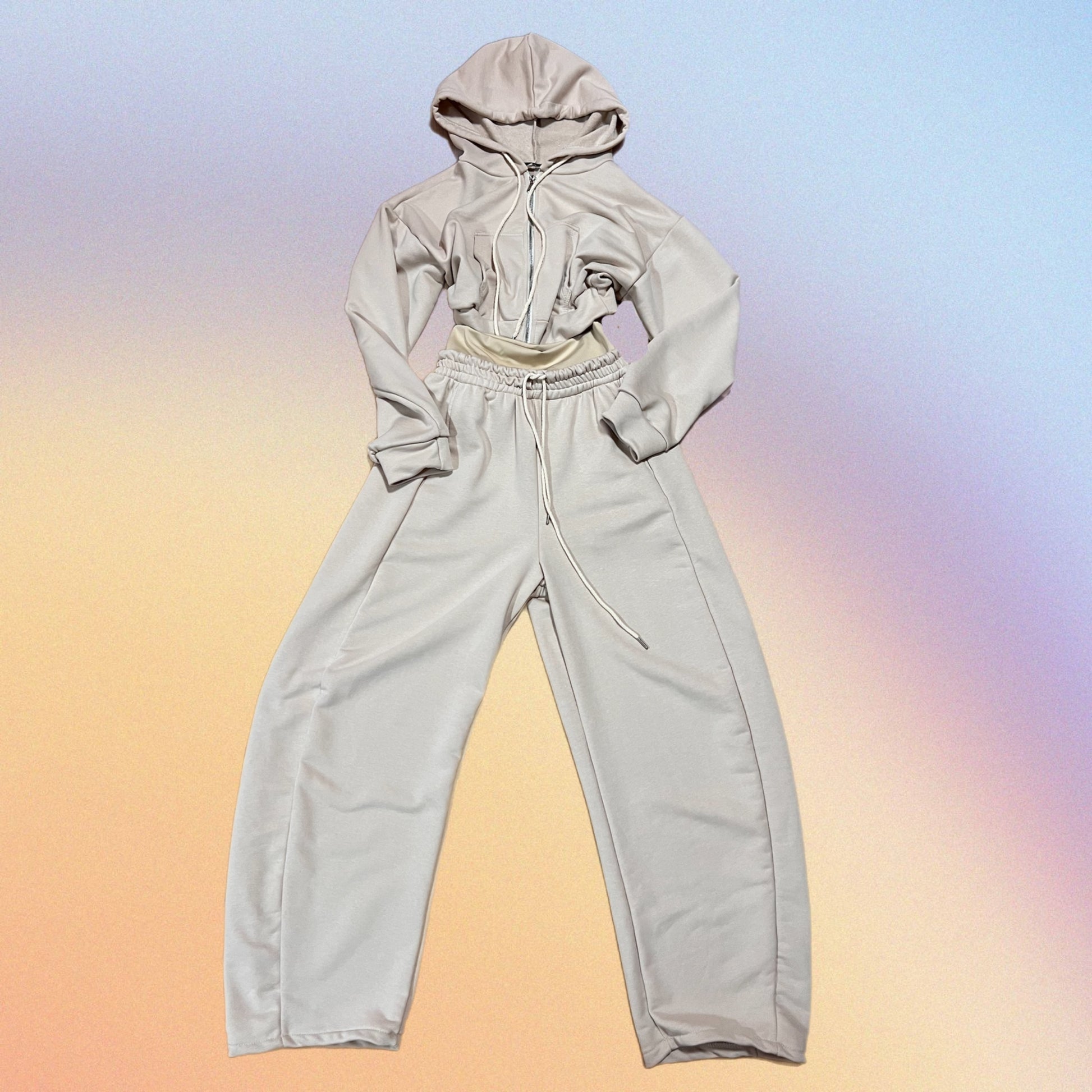 Cord-set composto da jogger Baloon con fascia in vita alta, e giacchino con cappuccio top crop. Entrambi in tessuto French Terry.