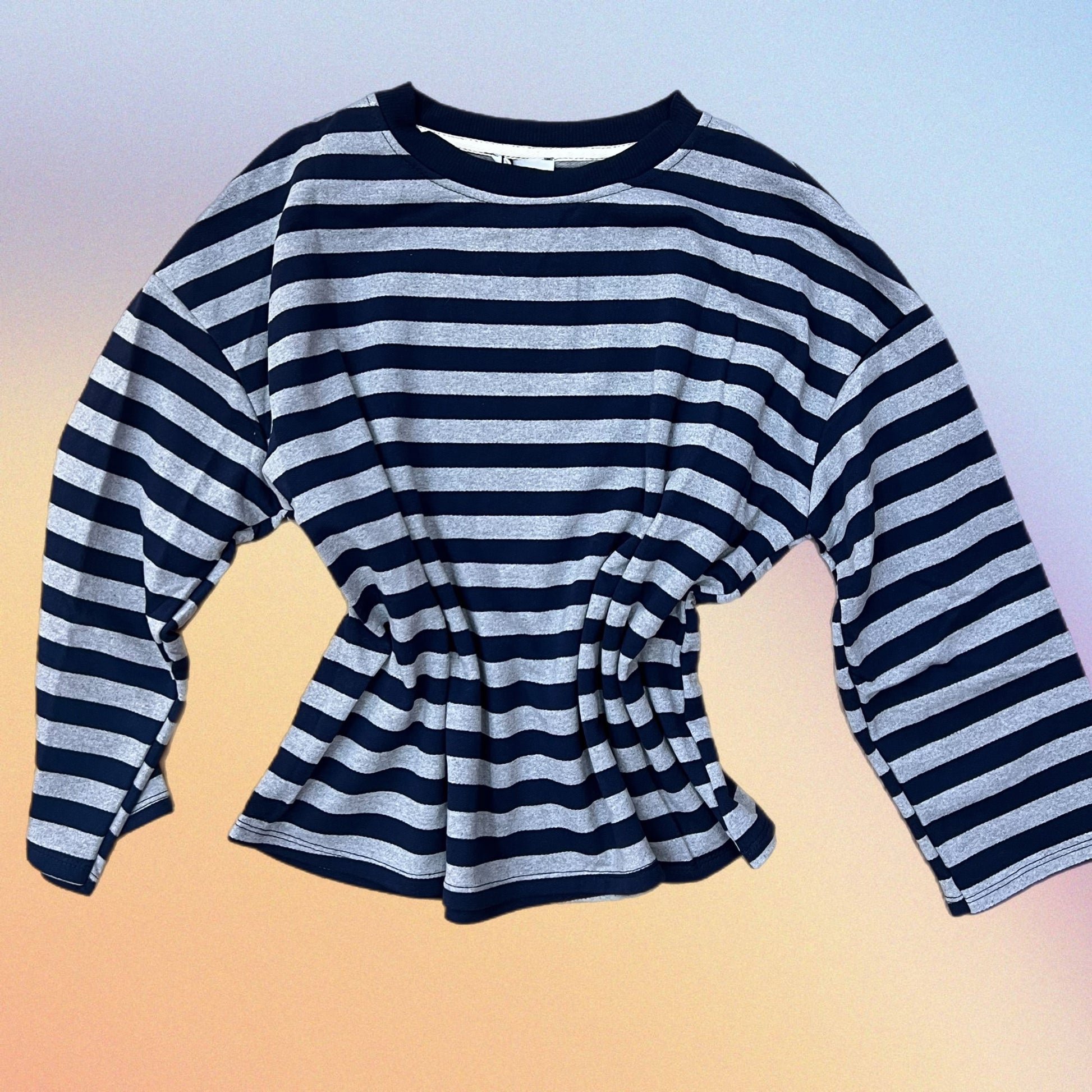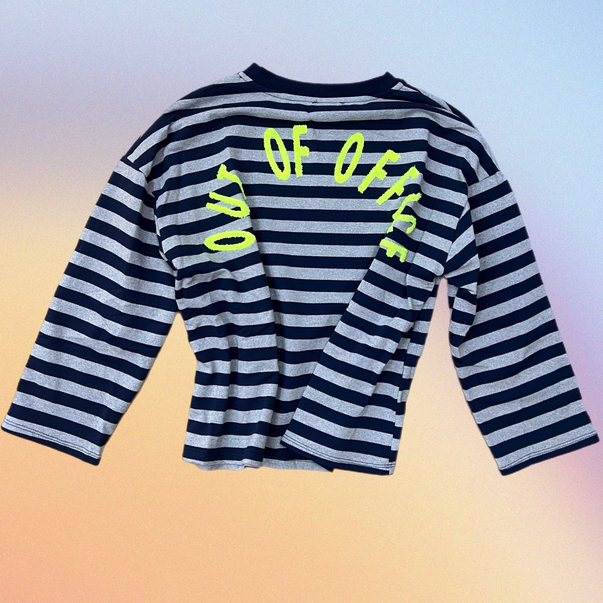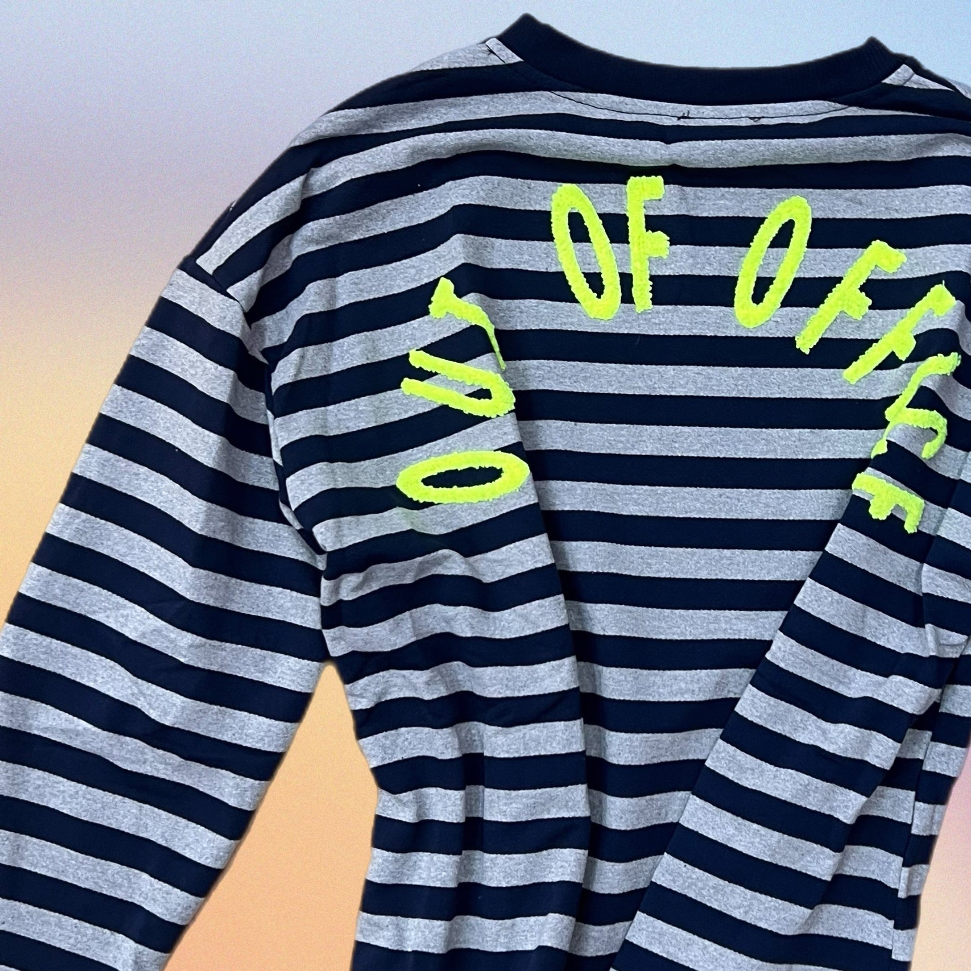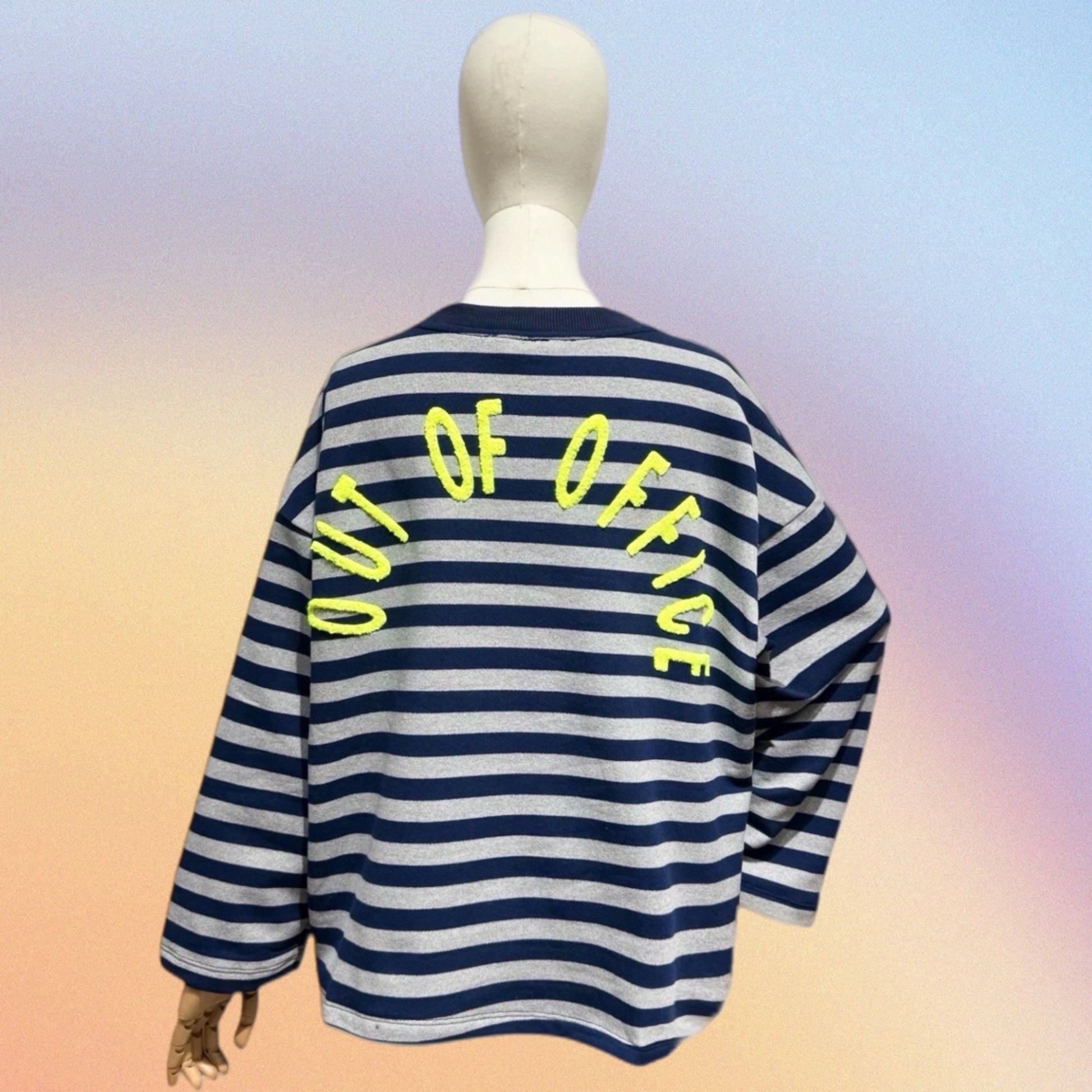 Felpa a righe a maniche lunghe con scollo rotondo e scritta OUT OF OFFICE sul retro
