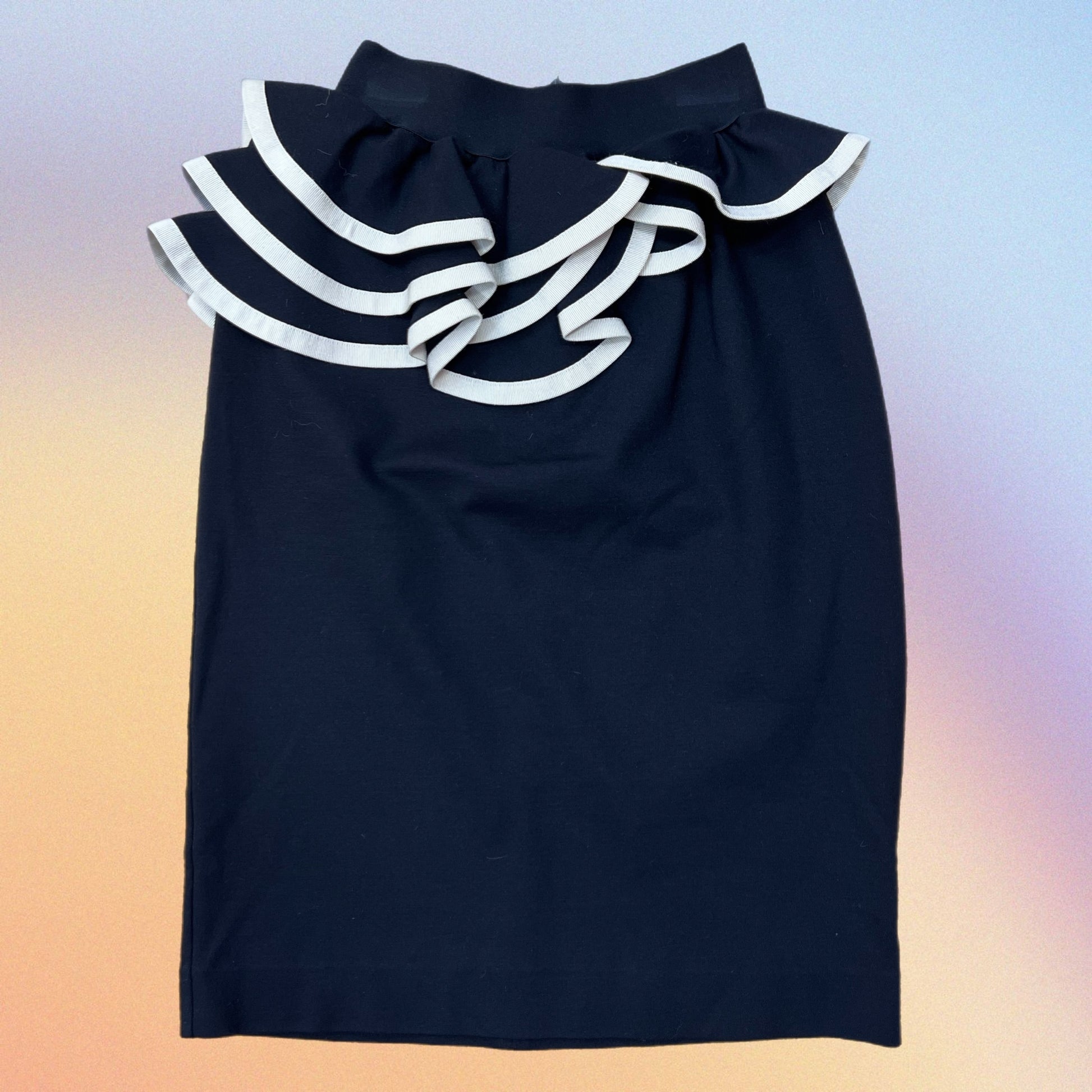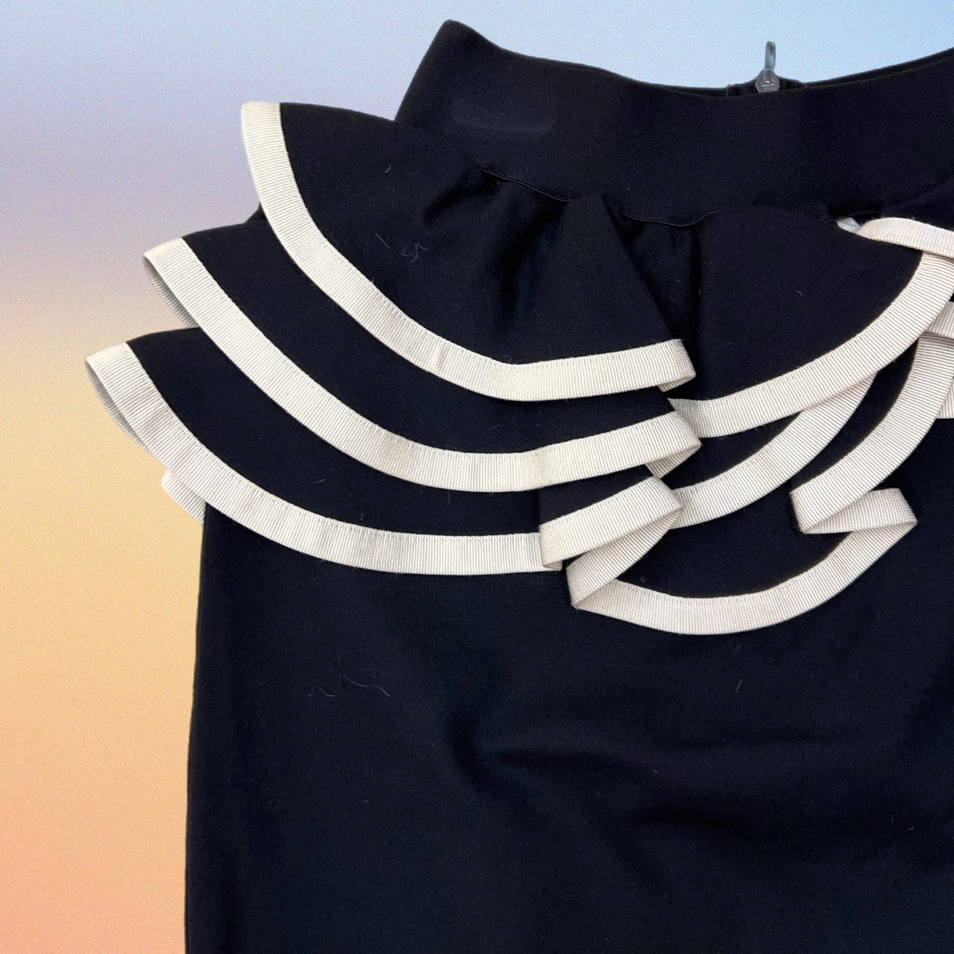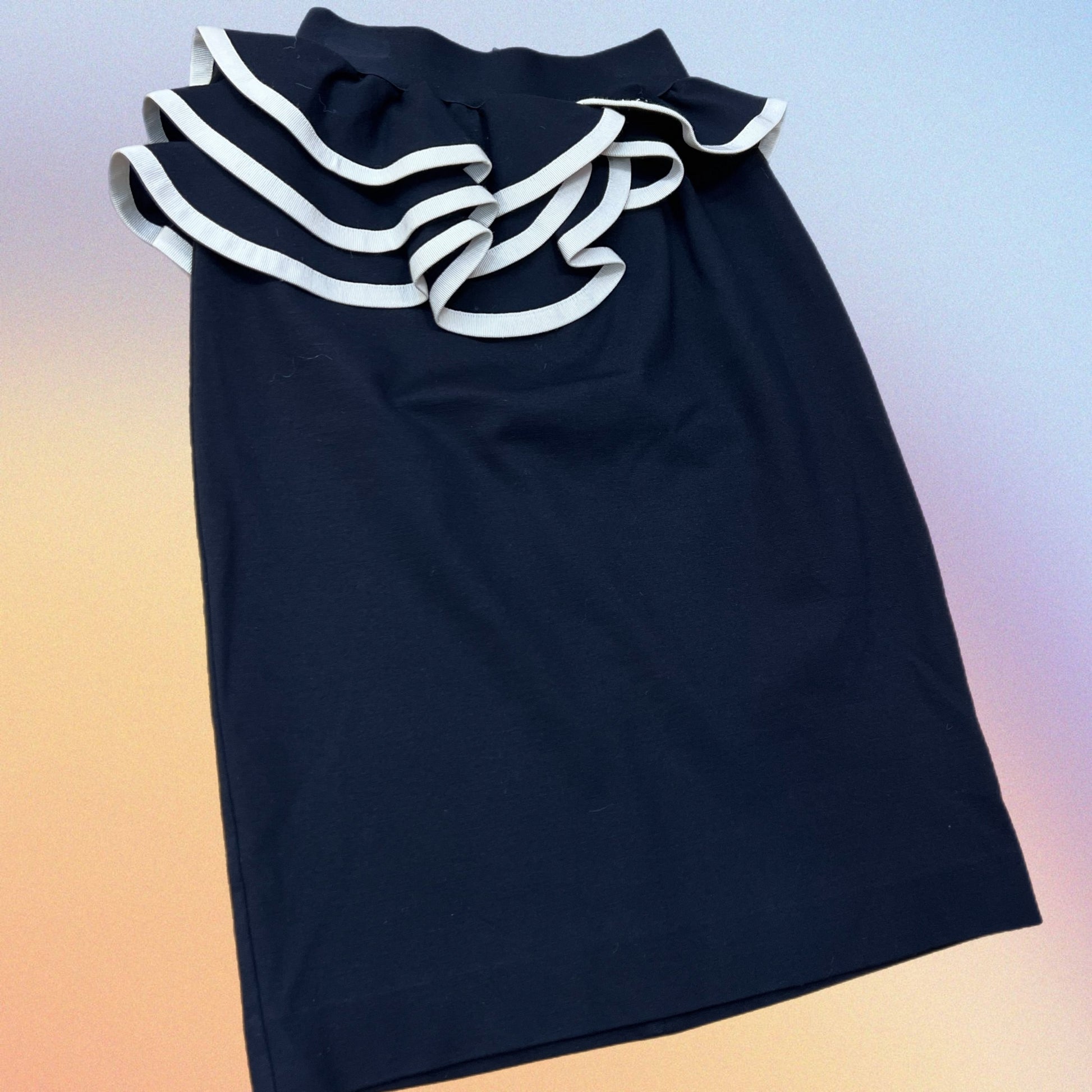 Gonna tubo aderente in jersey con drappeggio profilato in gros grain bianco. Banda elastica in vita e chiusura a cerniera. Vestibilità vita alta. Elasticizzata.