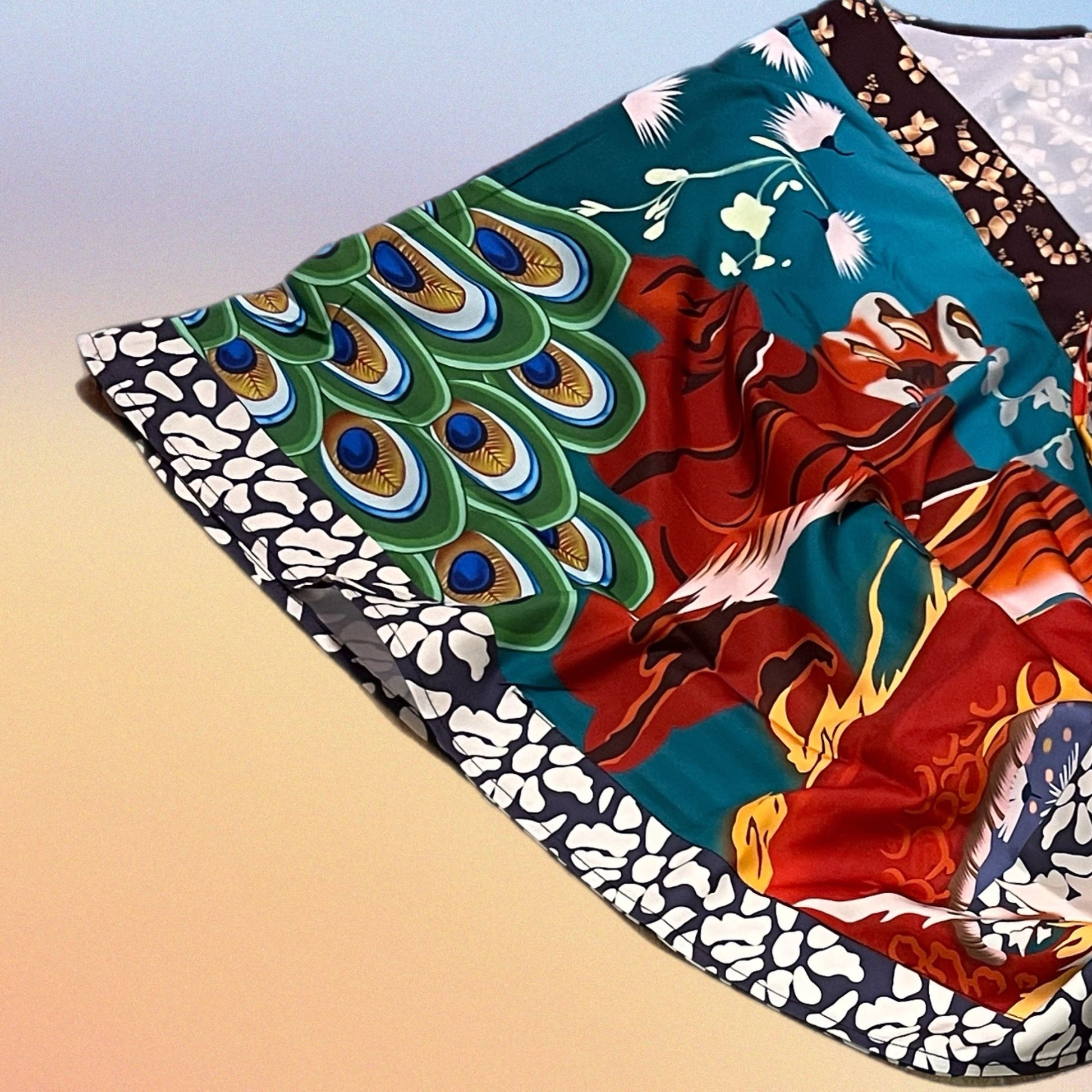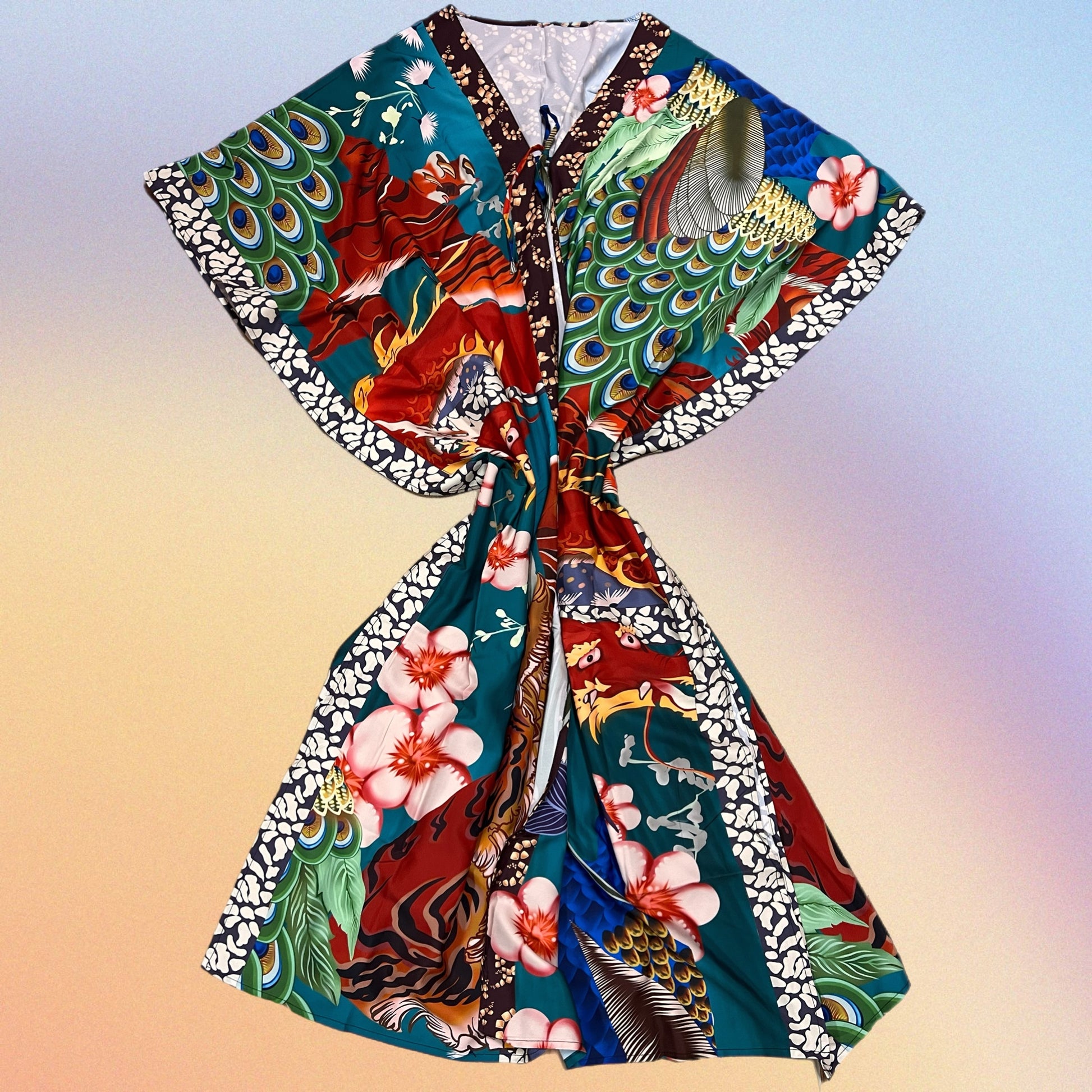 Kimono di lunghezza medio/lunga (caviglia )con motivi floreali e geometrici che si alternano in armonia. Colori sgargianti per uno stile contemporaneo e raffinato.