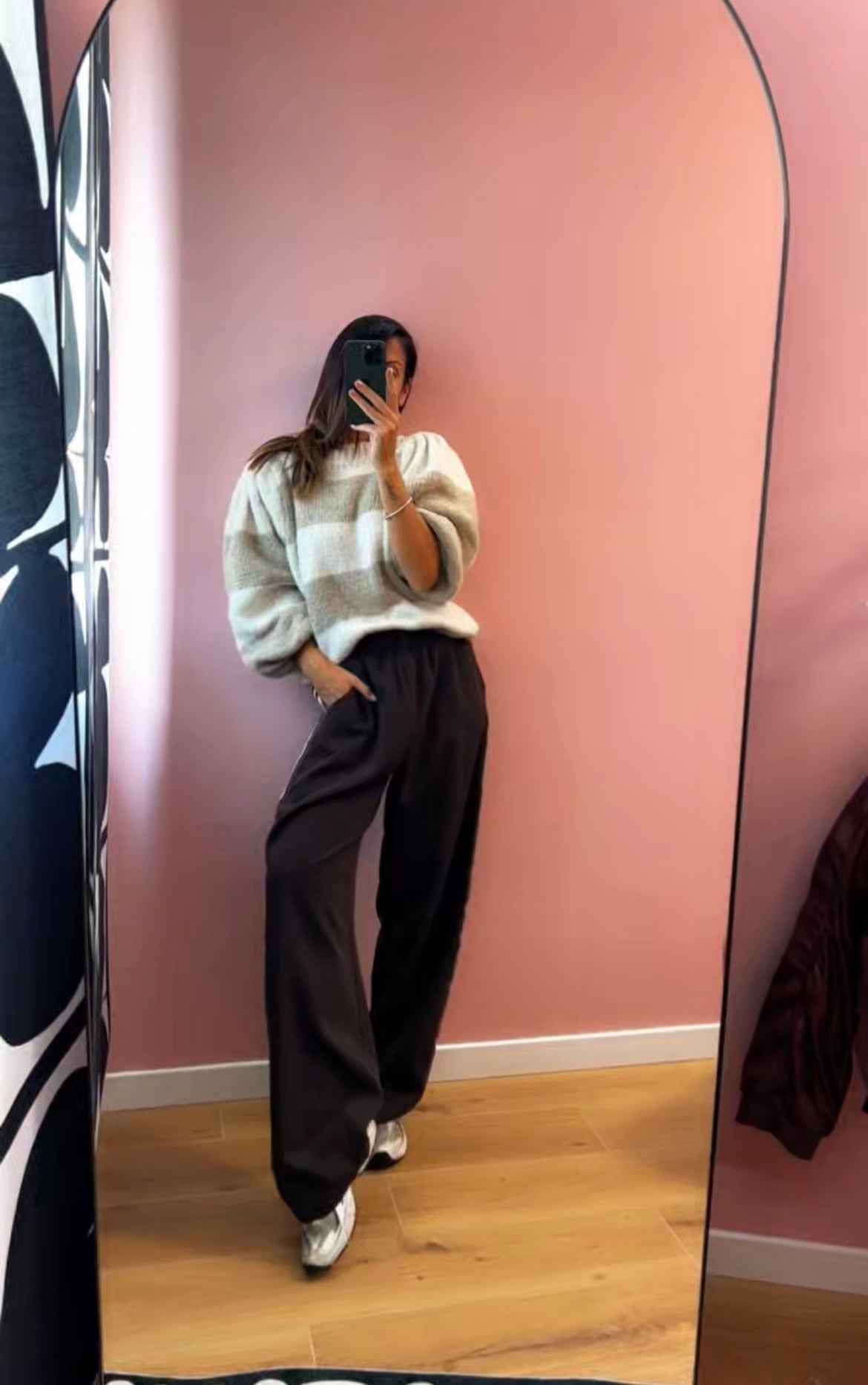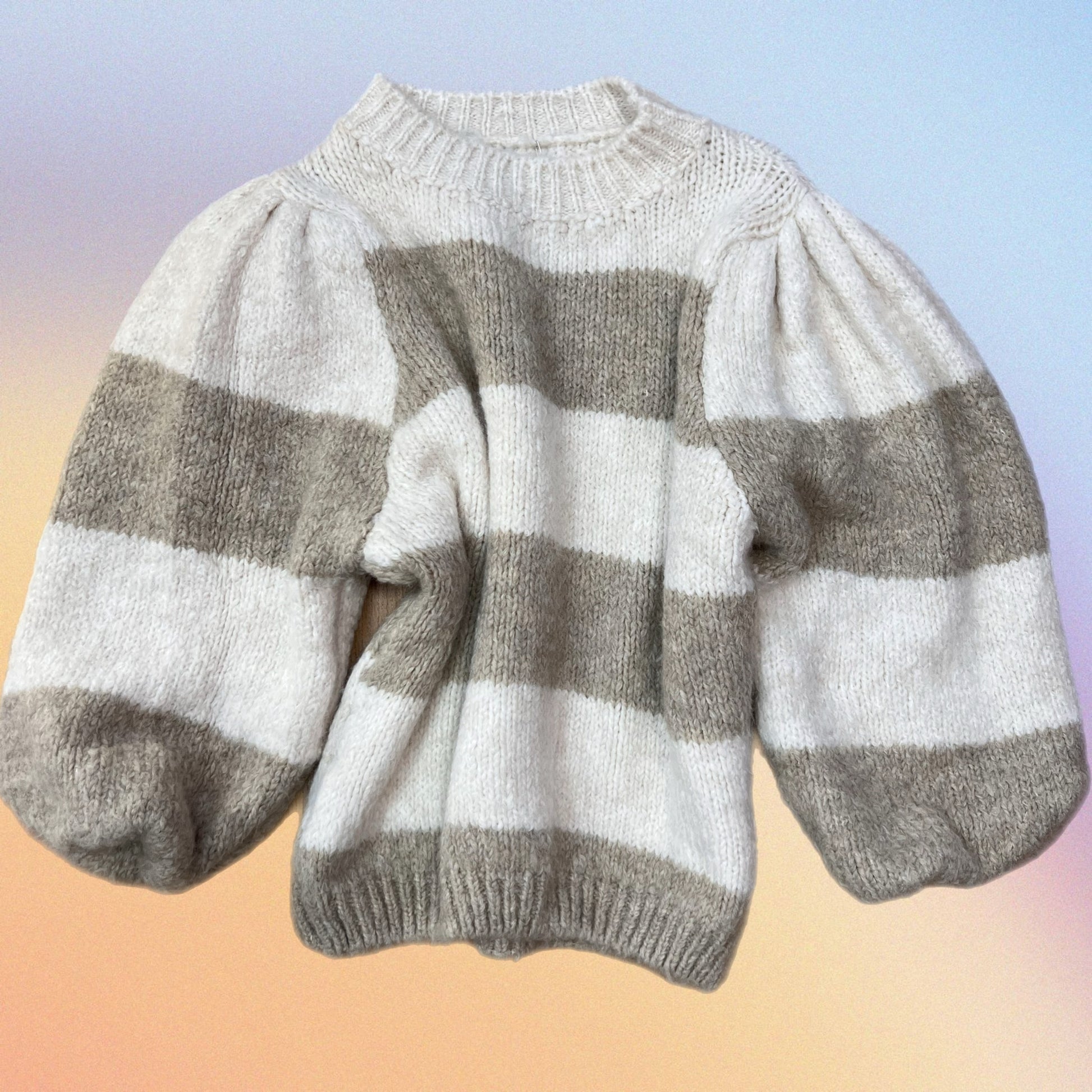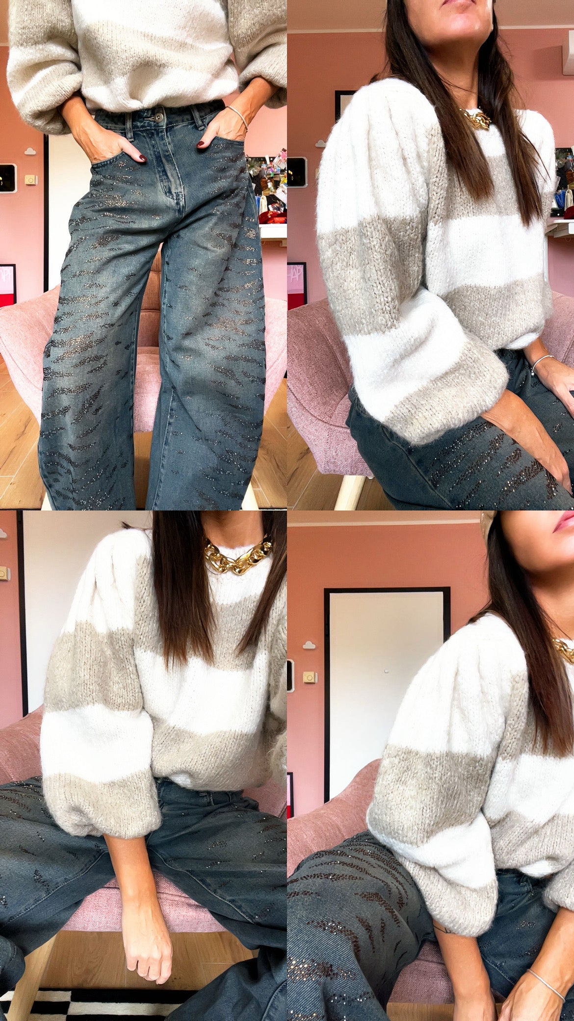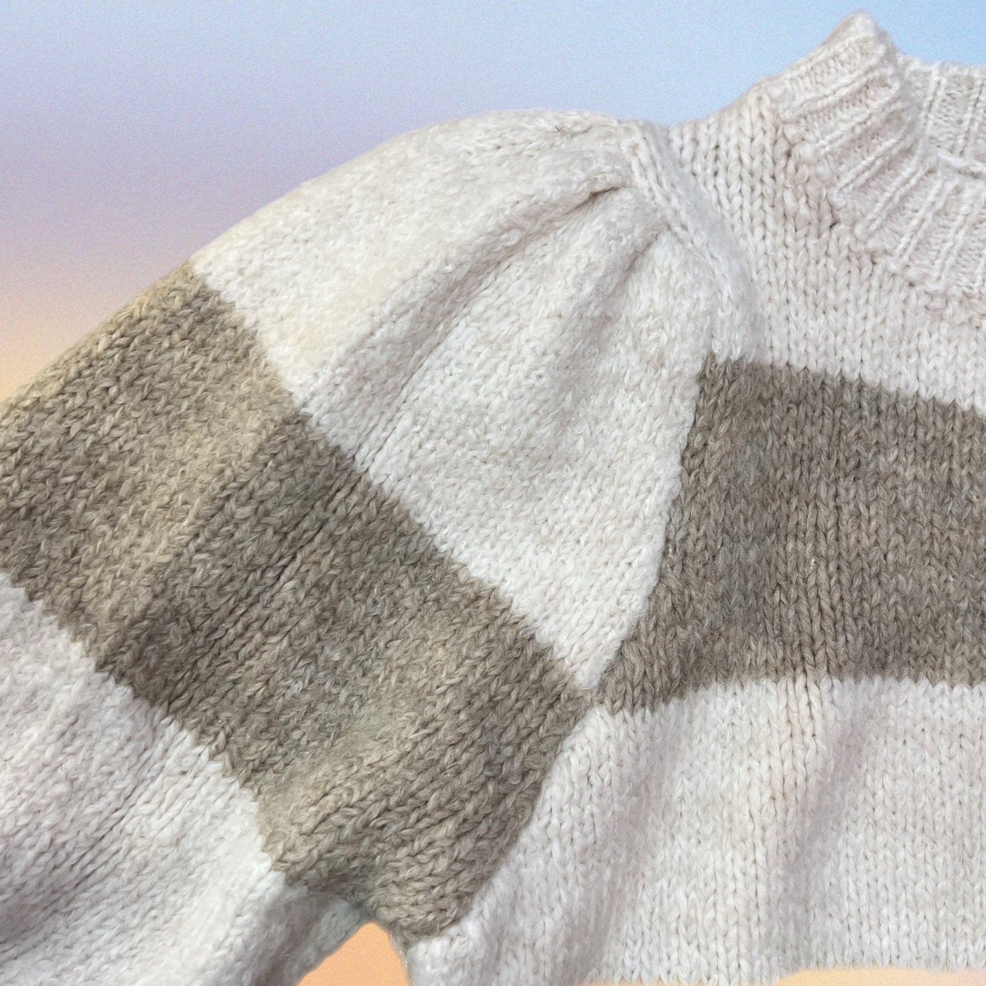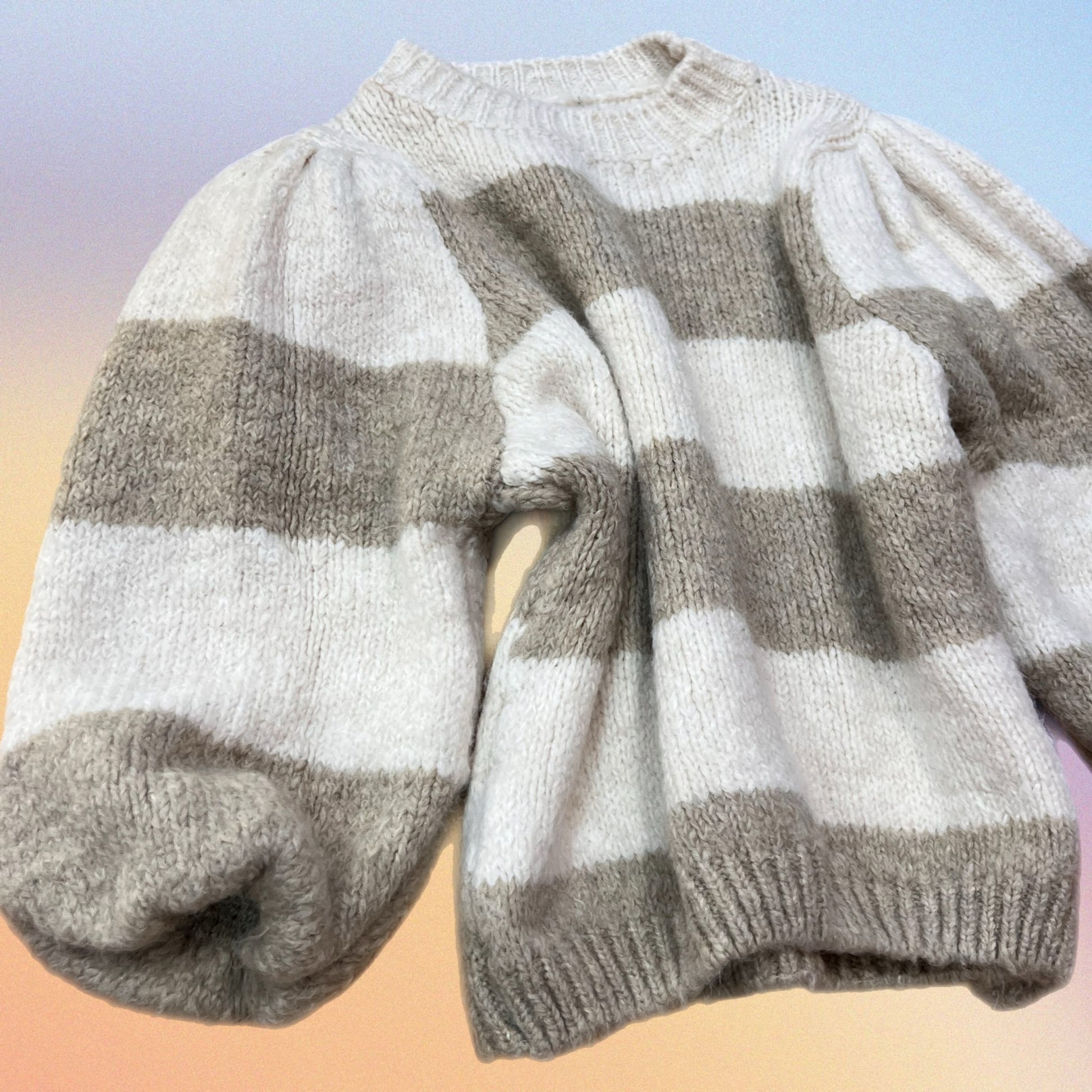 Maglioncino con spalle a sbuffo a tre quarti. Fantasia righe. Lunghezza primo fianco