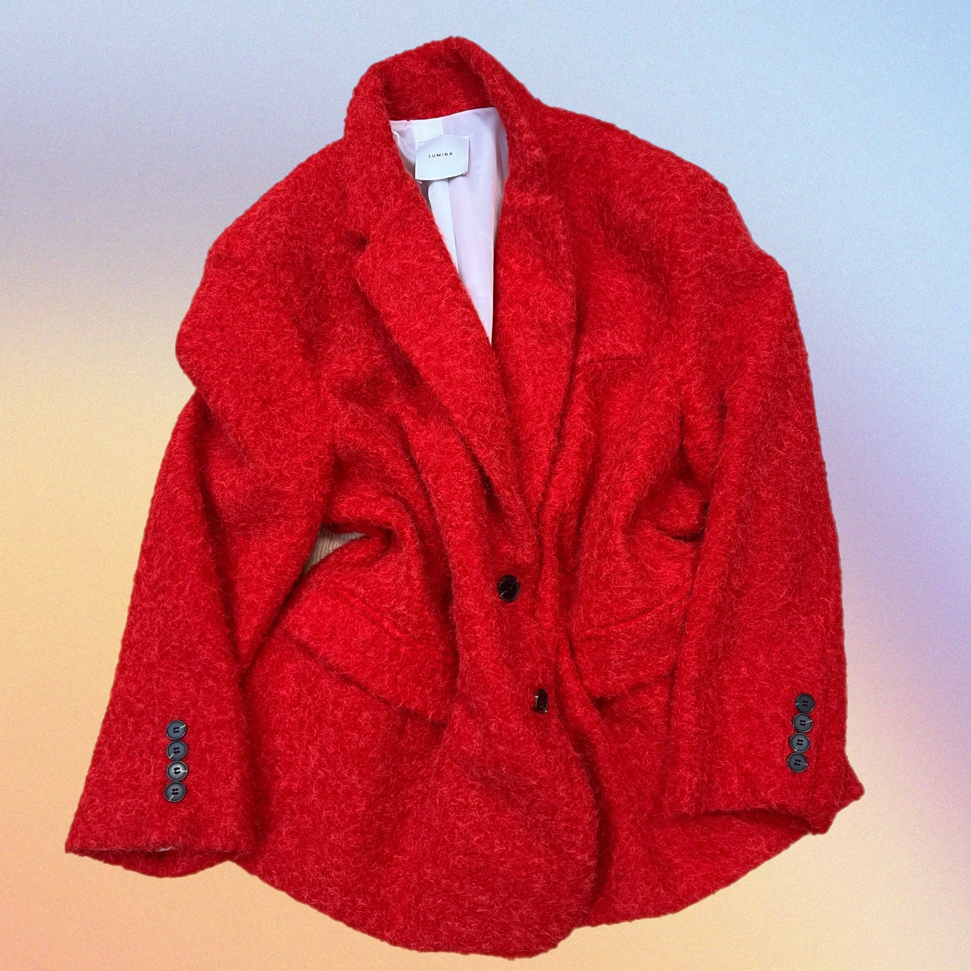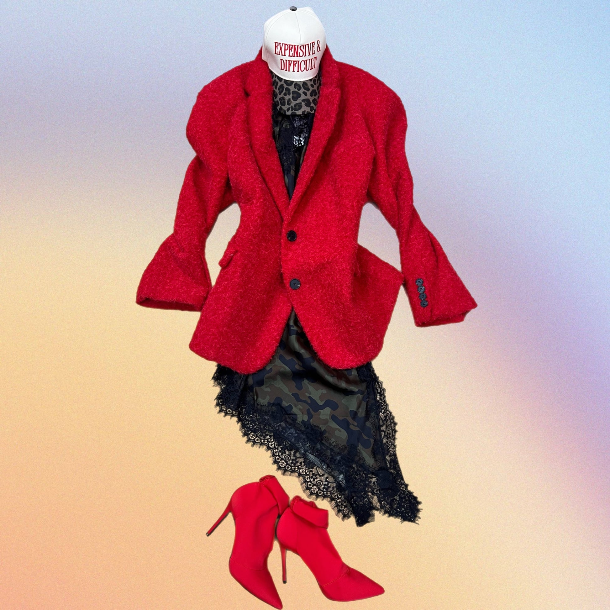 L’outfit comprende sleep dress in tessuto camouflage, blazer oversize in lana cotta color rosso.