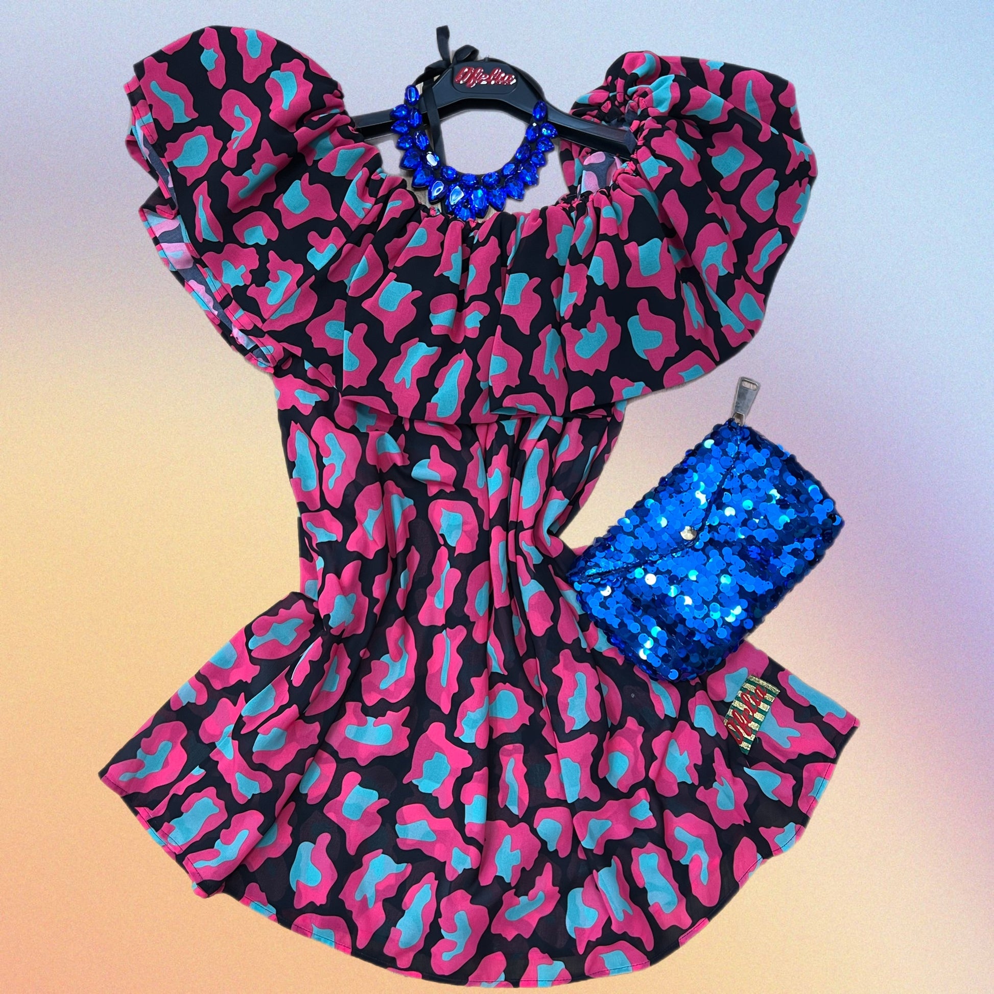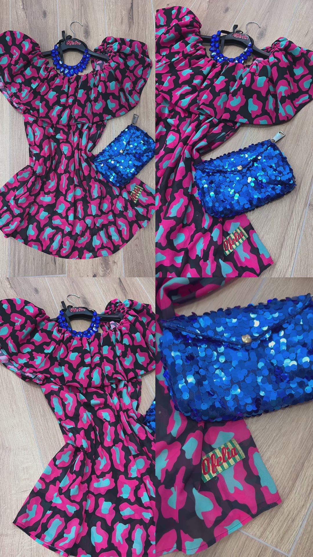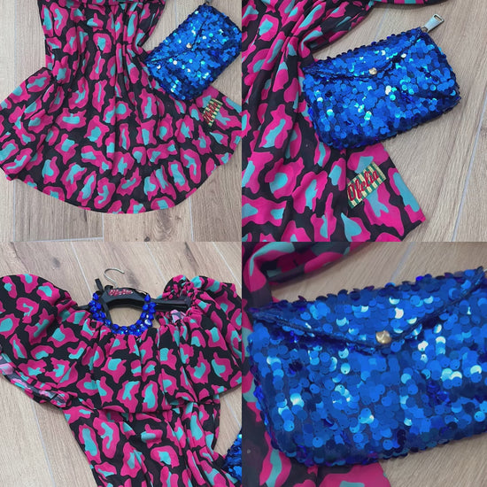 L’outfit comprende abito sartoriale targato Ofelia, pochette in pailette targata Ofelia, collana pietre
