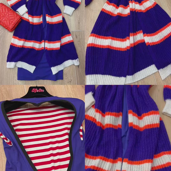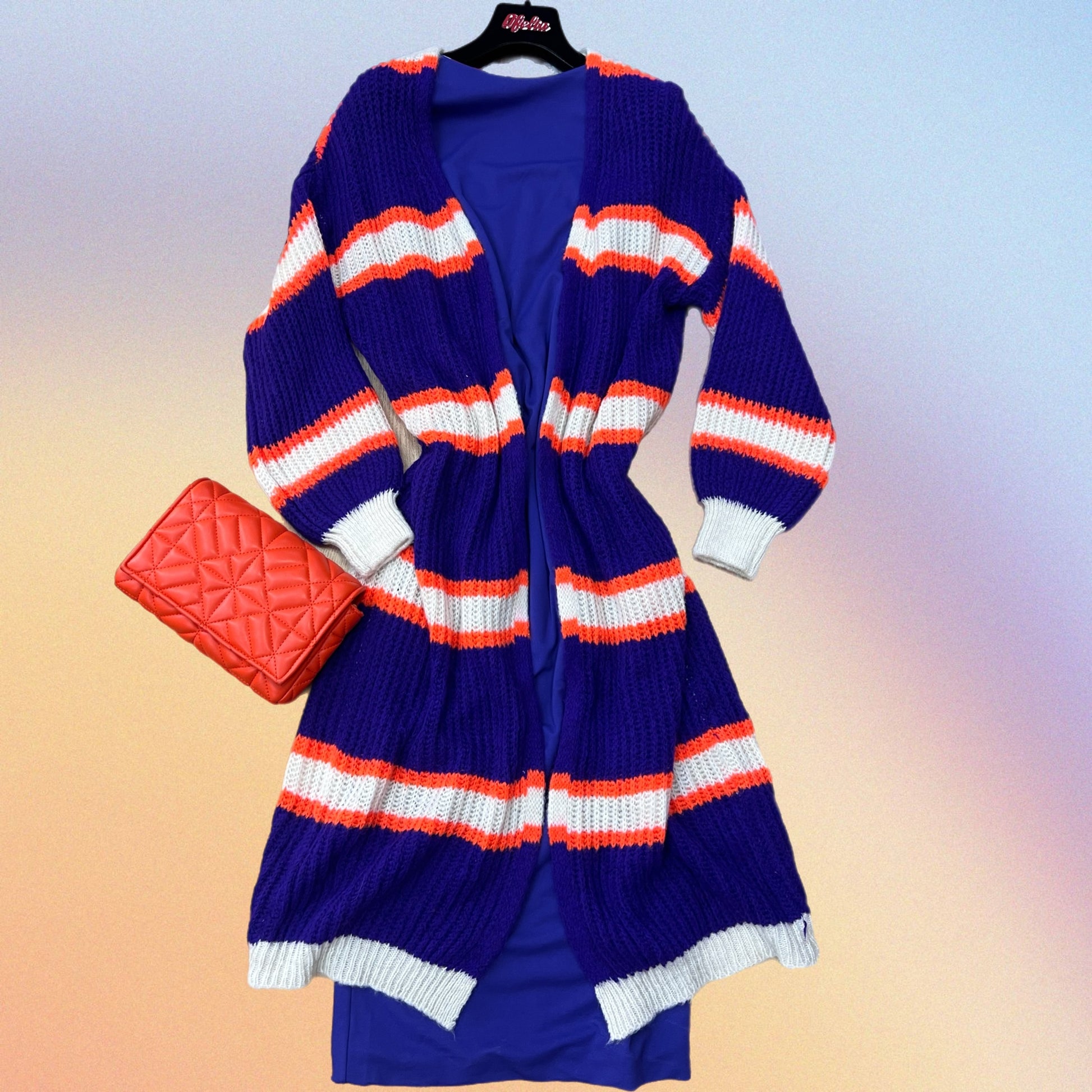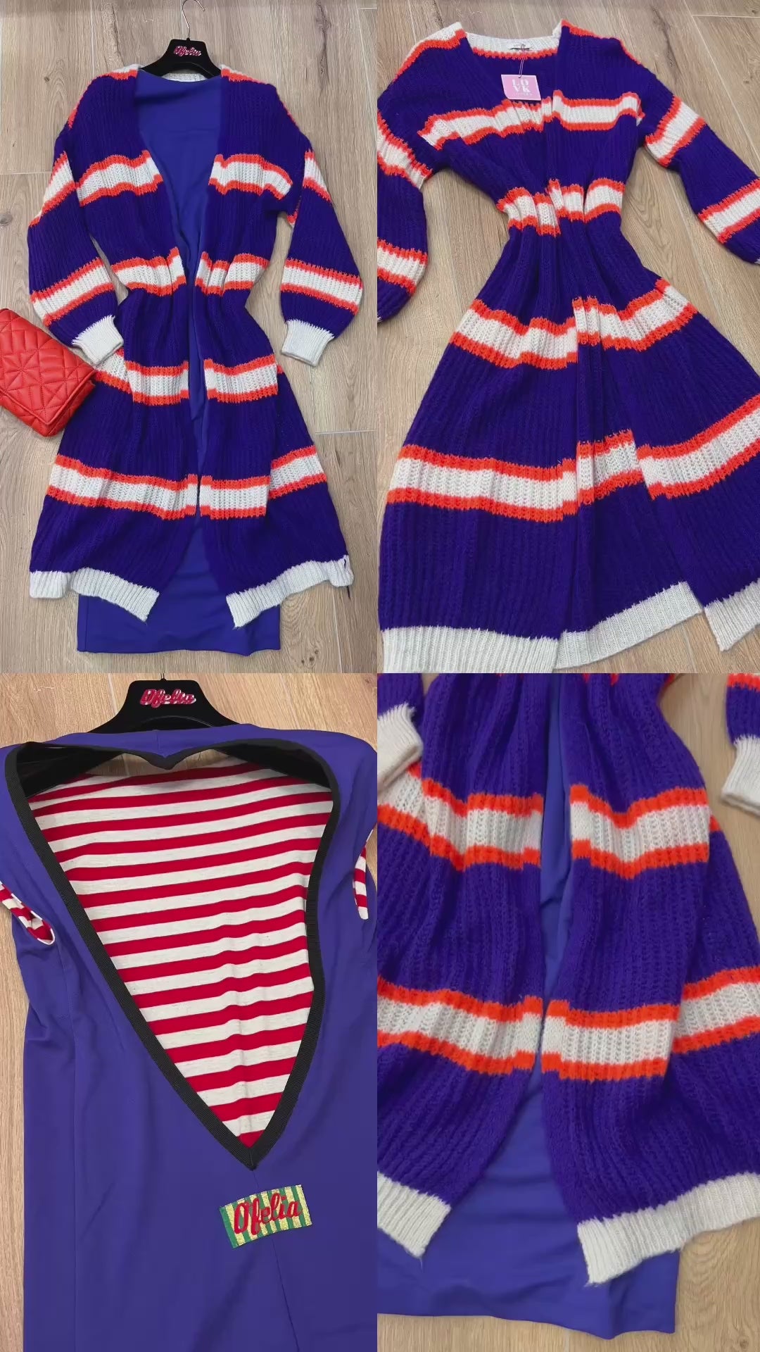 L’outfit comprende abito tubino con scollatura a cuore doubleface targato Ofelia, Cardigan lungo ampio a righe con polsini a costine
