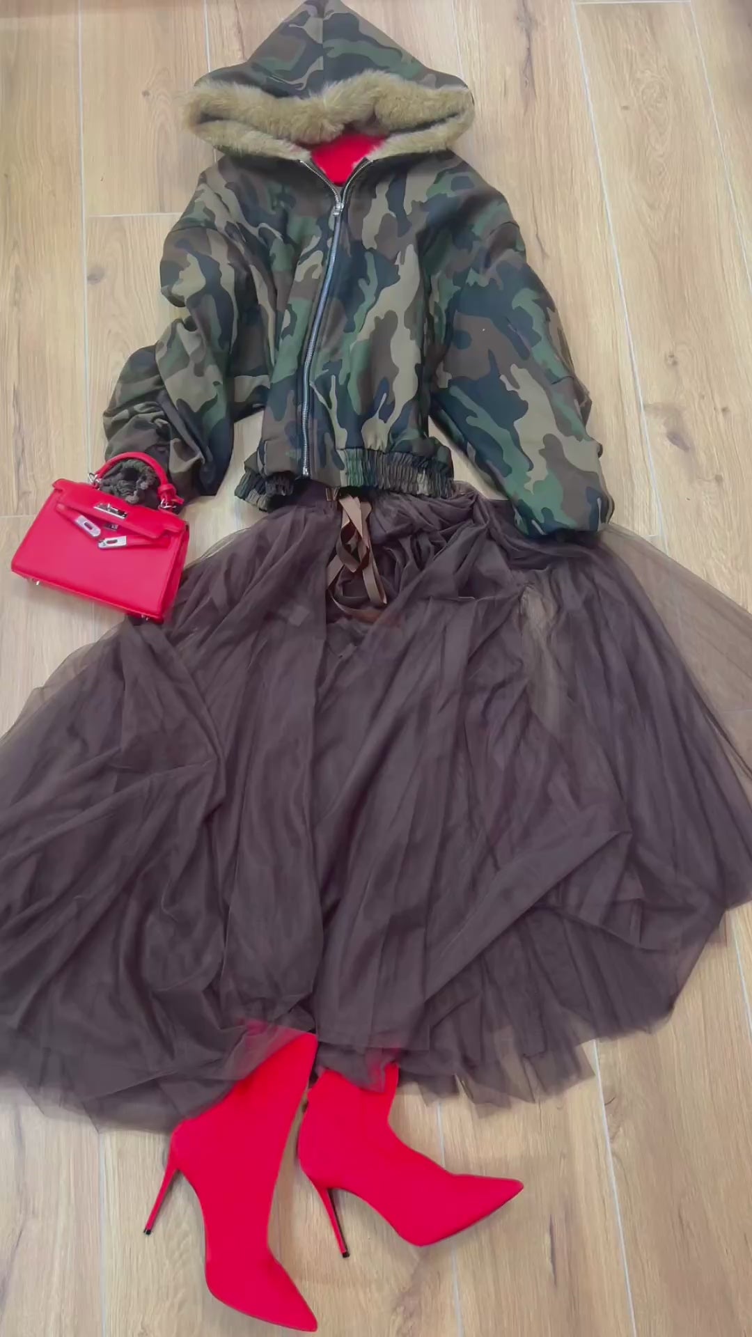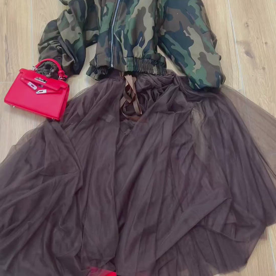 L’outfit comprende: gonna tulle Aria color cioccolato (disponibile in taglia S/M o M/L) blusetta Urban nera in viscosa, Bomber Rihanna in fantasia Camouflage.