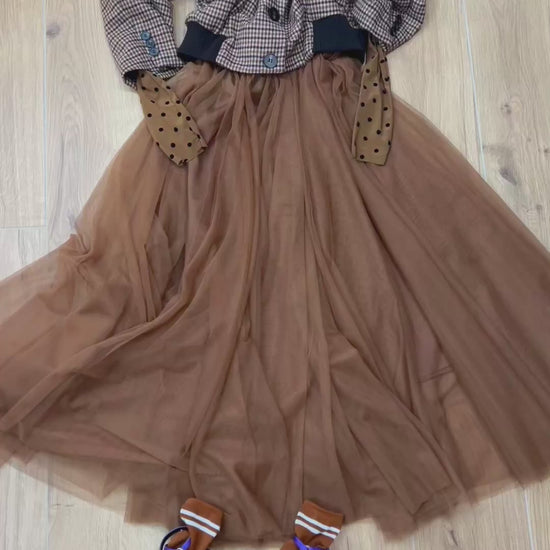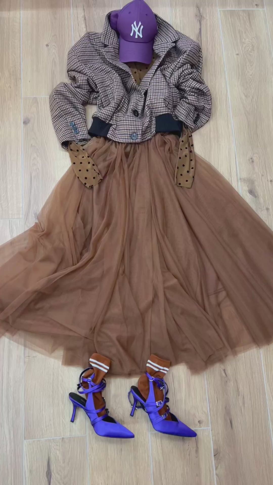 L’outfit include: gonna tulle Aria color nocciola ( disponibile in misura S/M o M/L) , blusetta in tulle a pois color nocciola, bomberino scacchi profilato in camoscio color nocciola, Decoltè in raso targate Stephen Good London ( disponibile in numero 37•38•39)