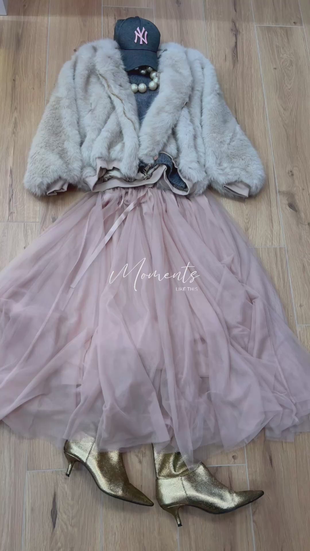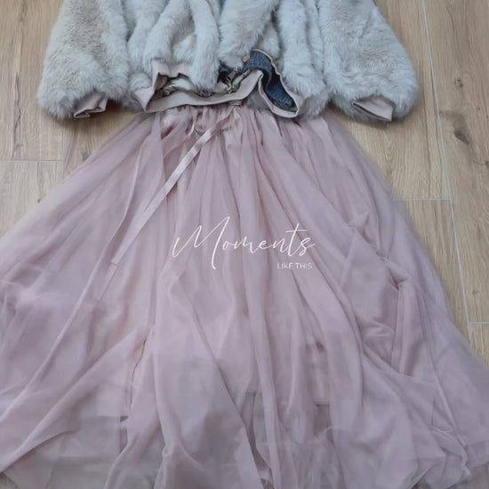 L’outfit comprende: gonna in tulle Aria color rosa polvere ( disponibile in taglia S/M o M/L) maglioncino Dolly color grigio antracite, pelliccia Samantha J color burro con collo e polsini color rosa polvere.