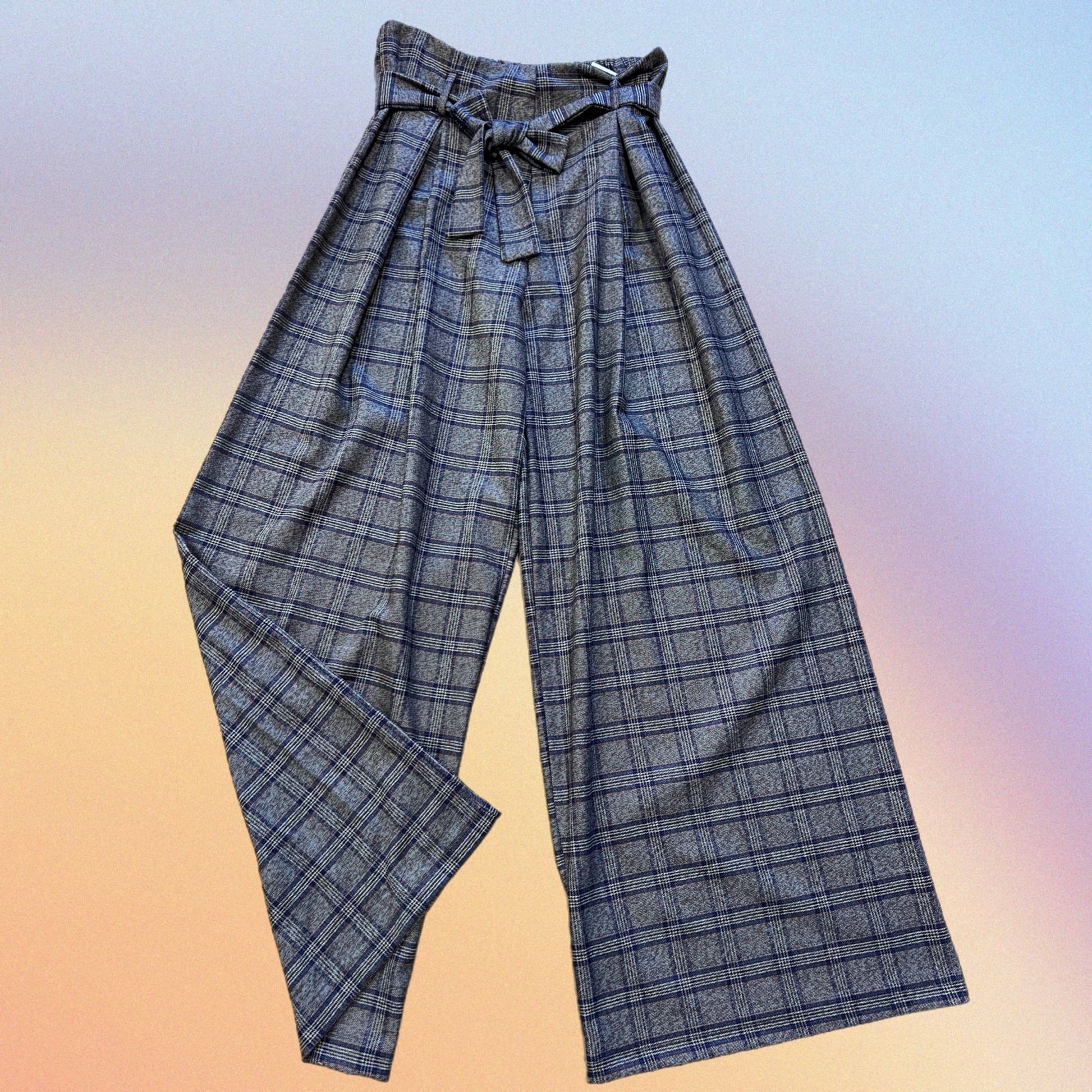 Pantaloni sartoriali modello palazzo. Vita alta con elastico e fusciacca in vita. Fantasia Principe di Galles