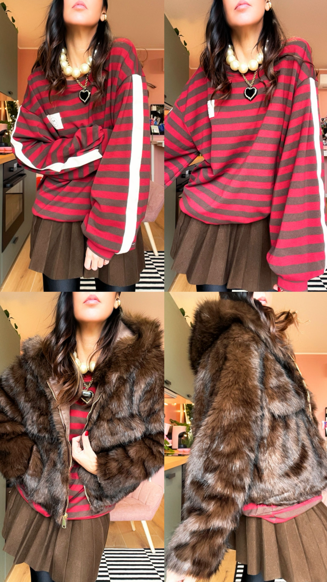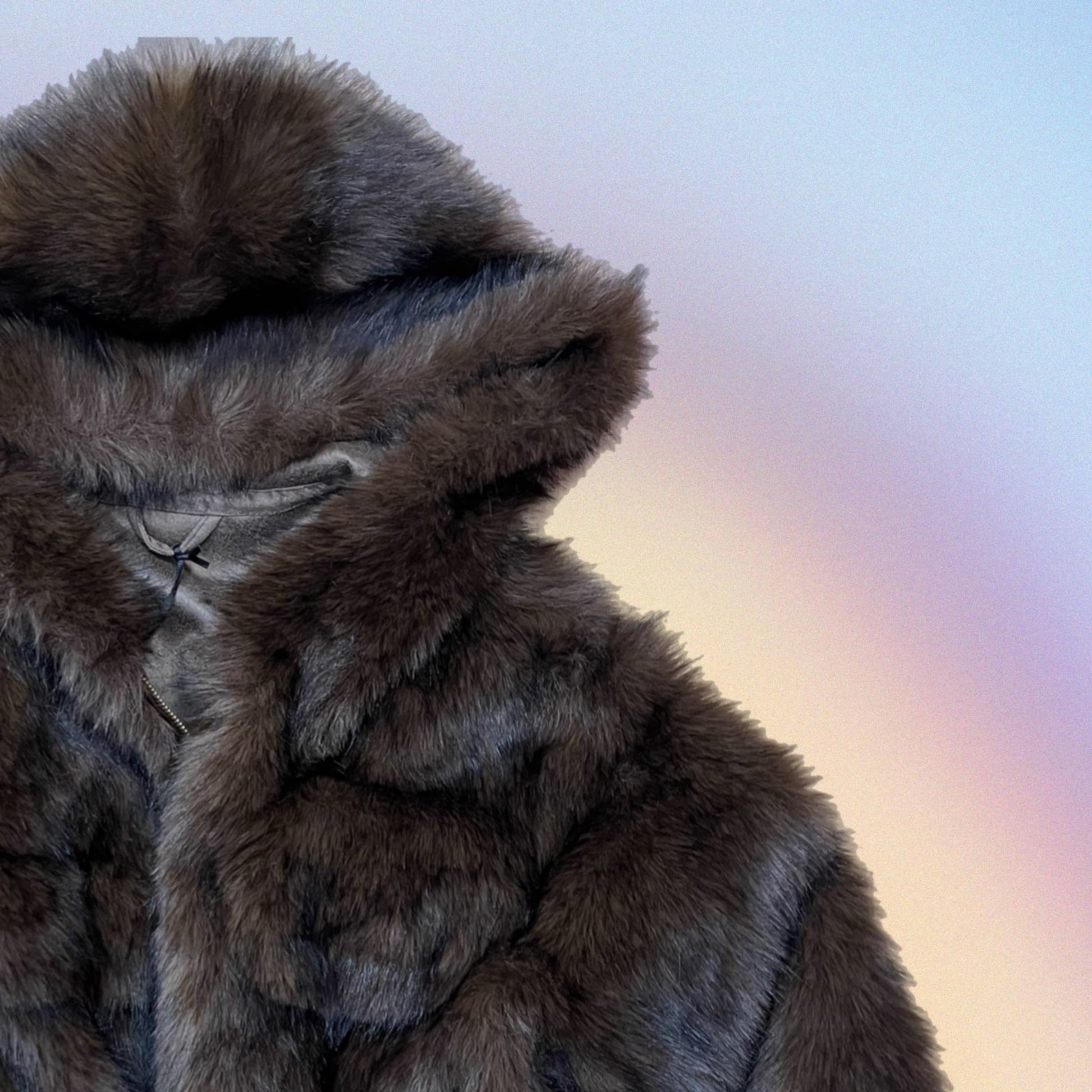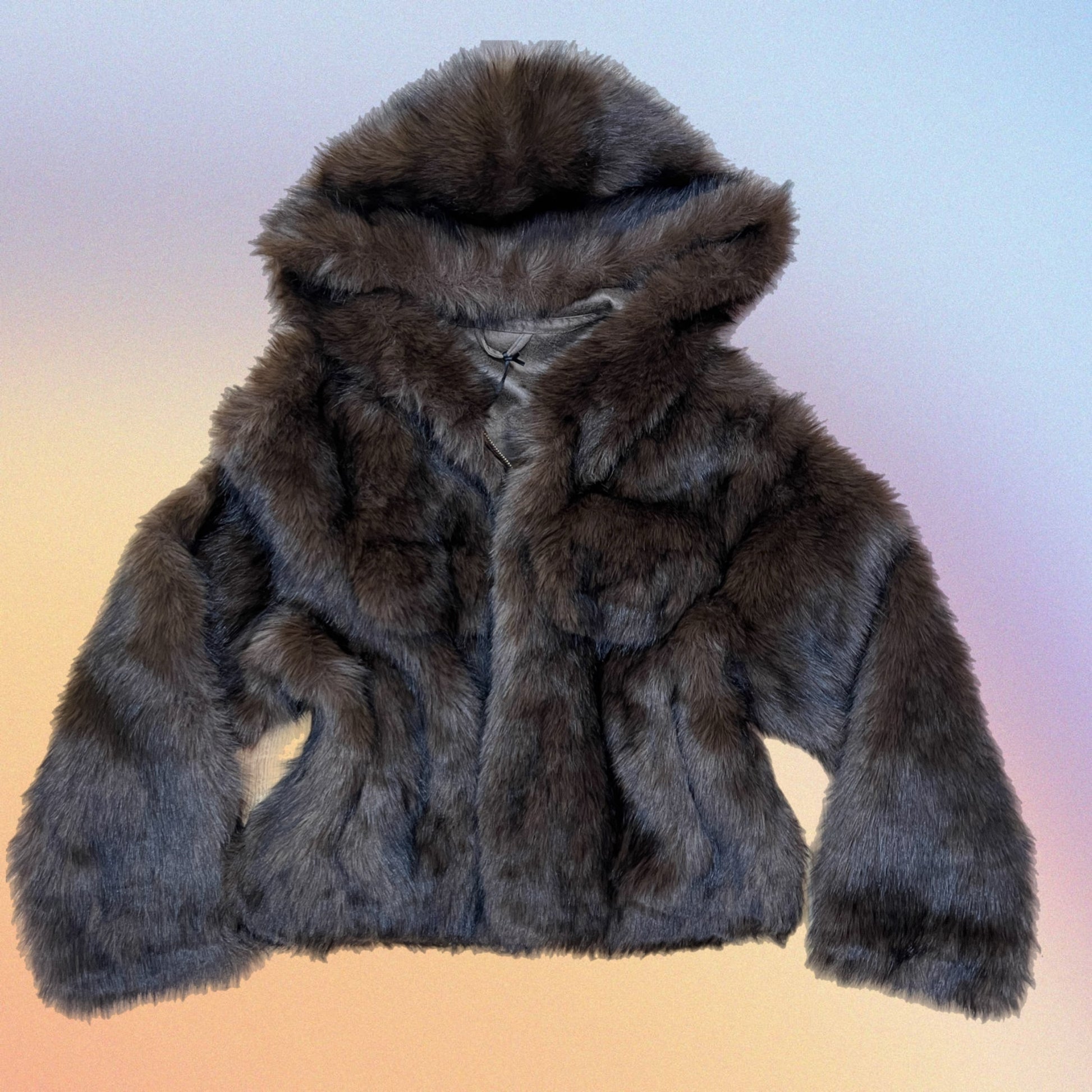 Pelliccia eco-fur con cappuccio. Modello corto. Con zip e taschini a patta finti frontali. Tasche laterali.
