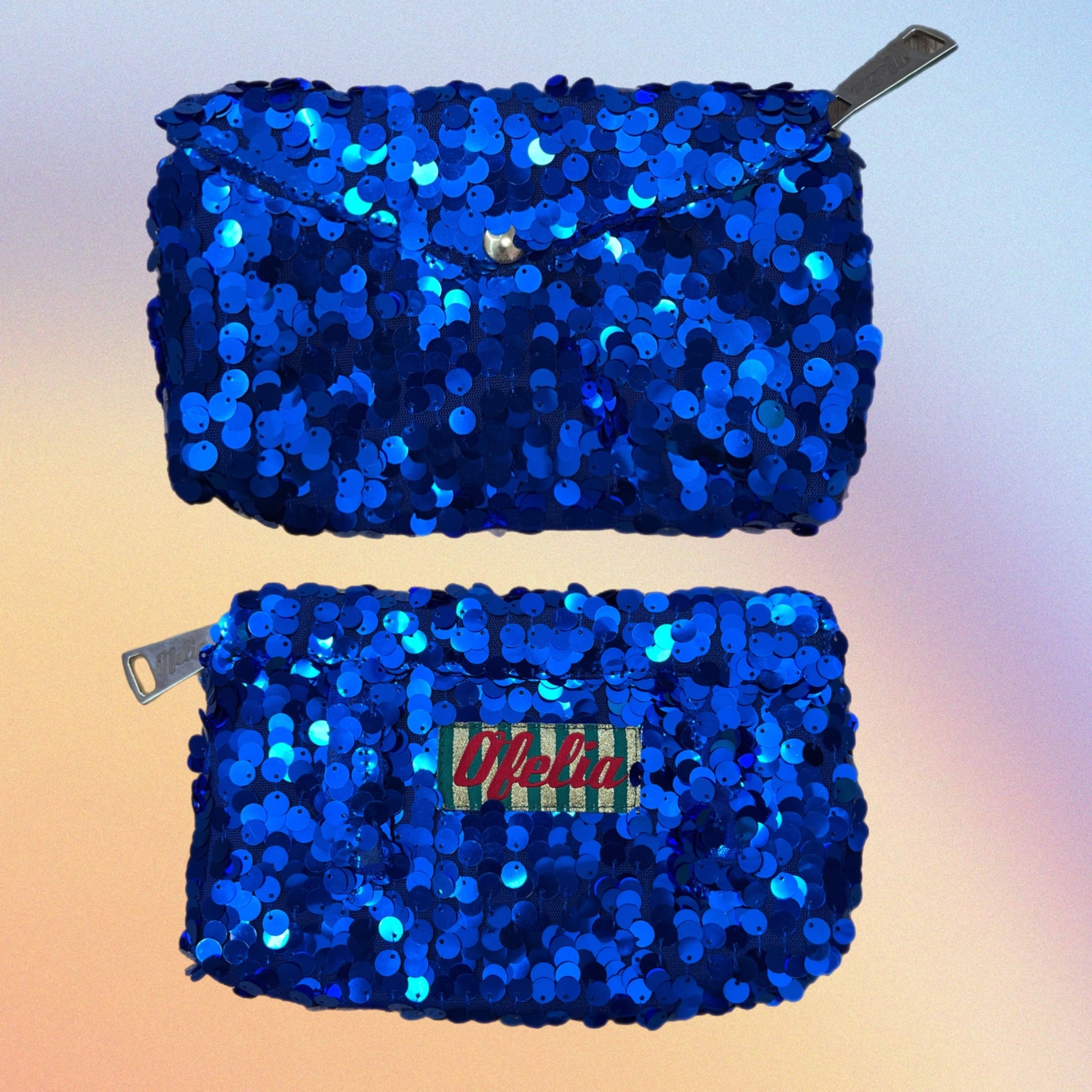 Pochette in pailette blu targata Ofelia. No tracolla. Misure: 20cm (lunghezza) 12cm (altezza)
