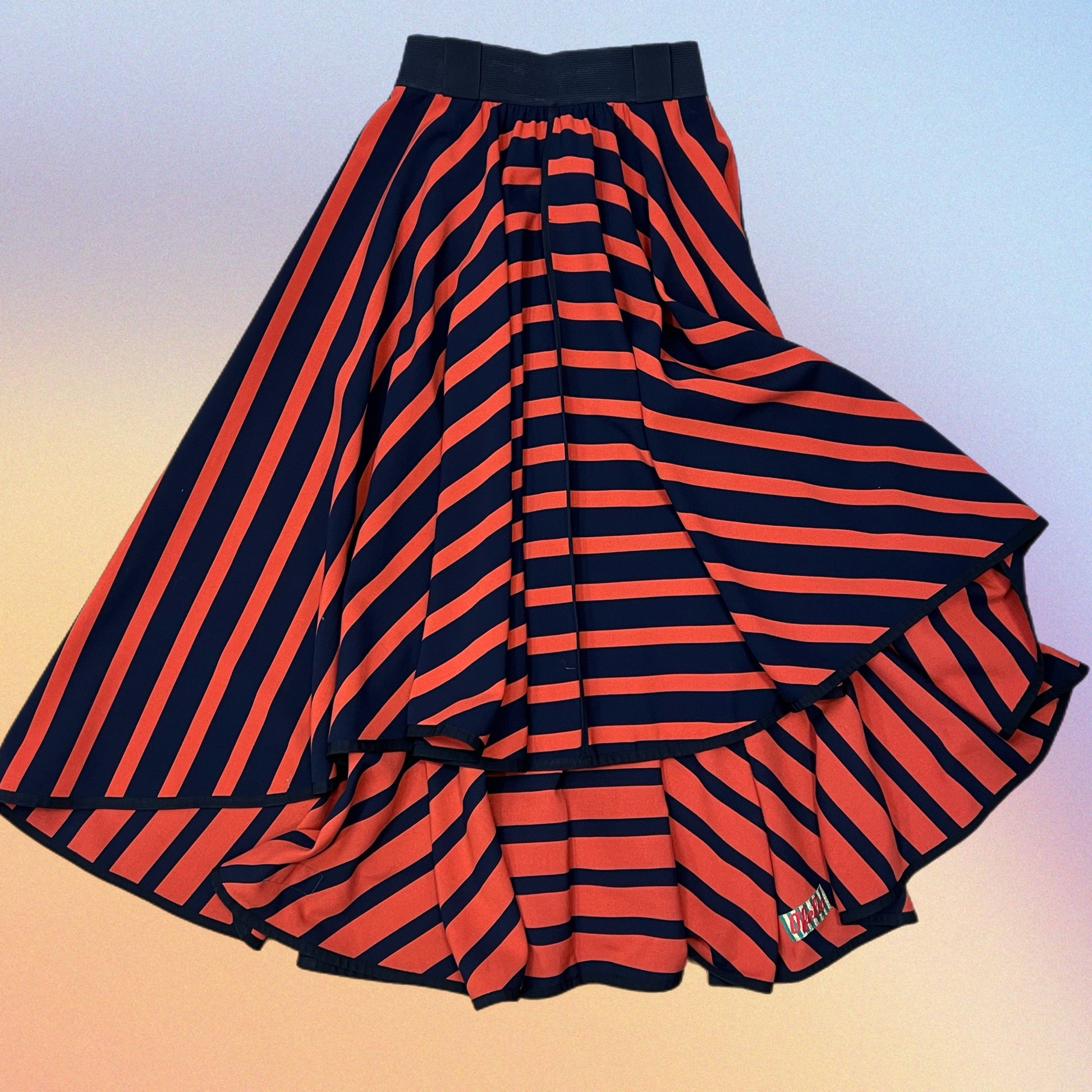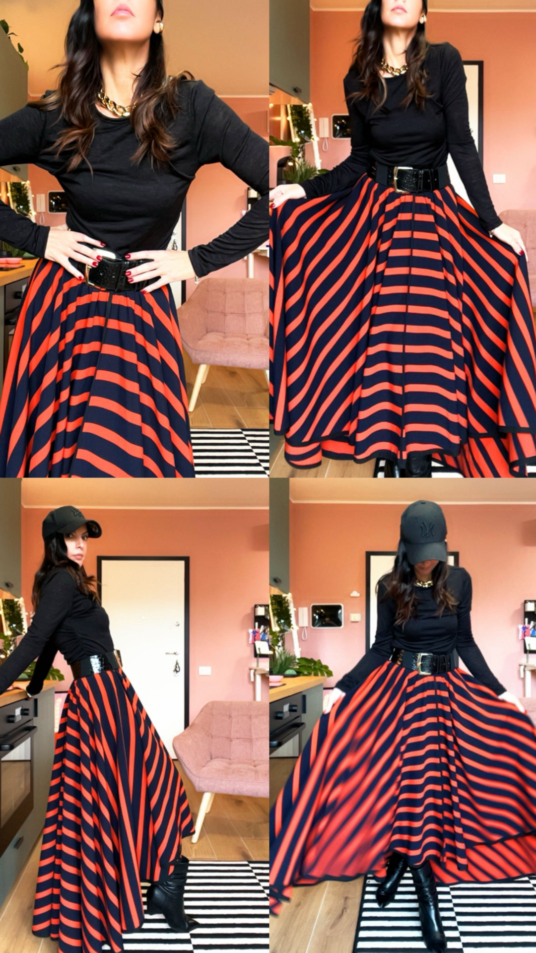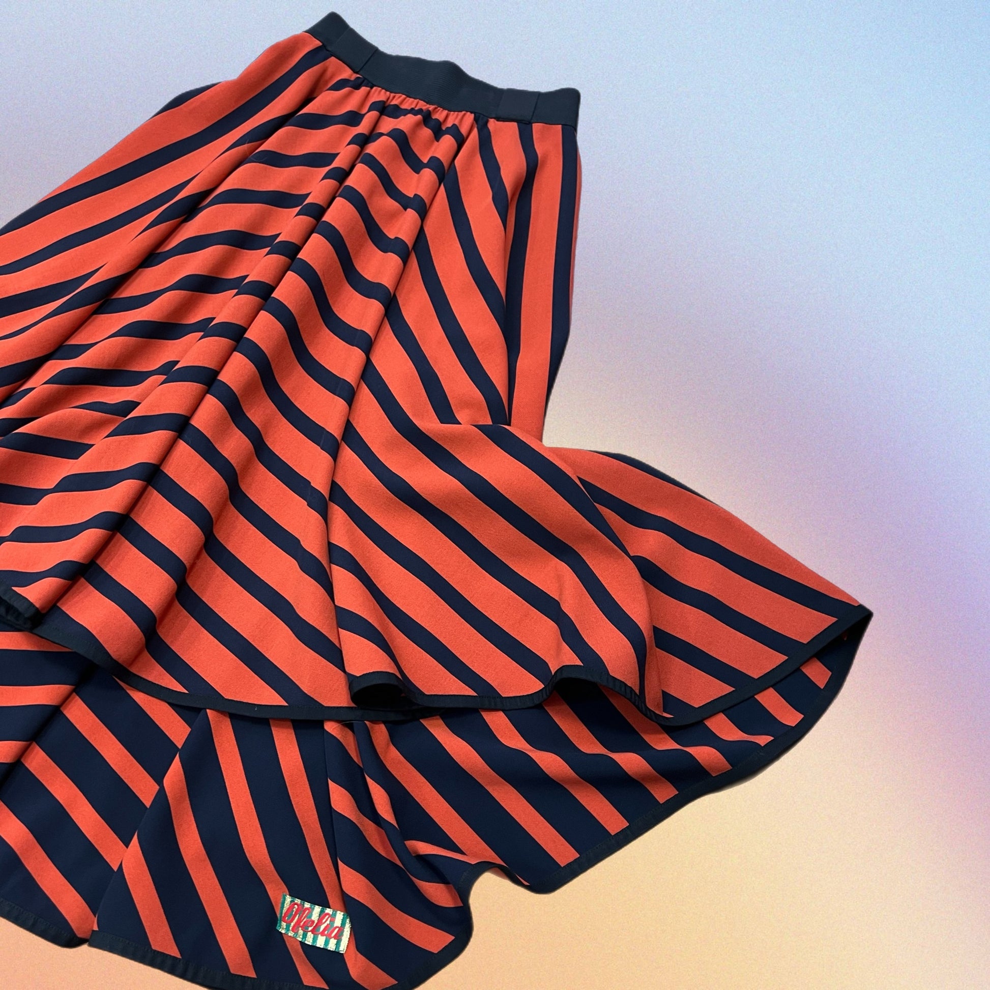 Stragonna doubleface a righe targata Ofelia. Banda elastica in vita con passanti. Interamente profilata in gros grain nero. Taglia Unica.
