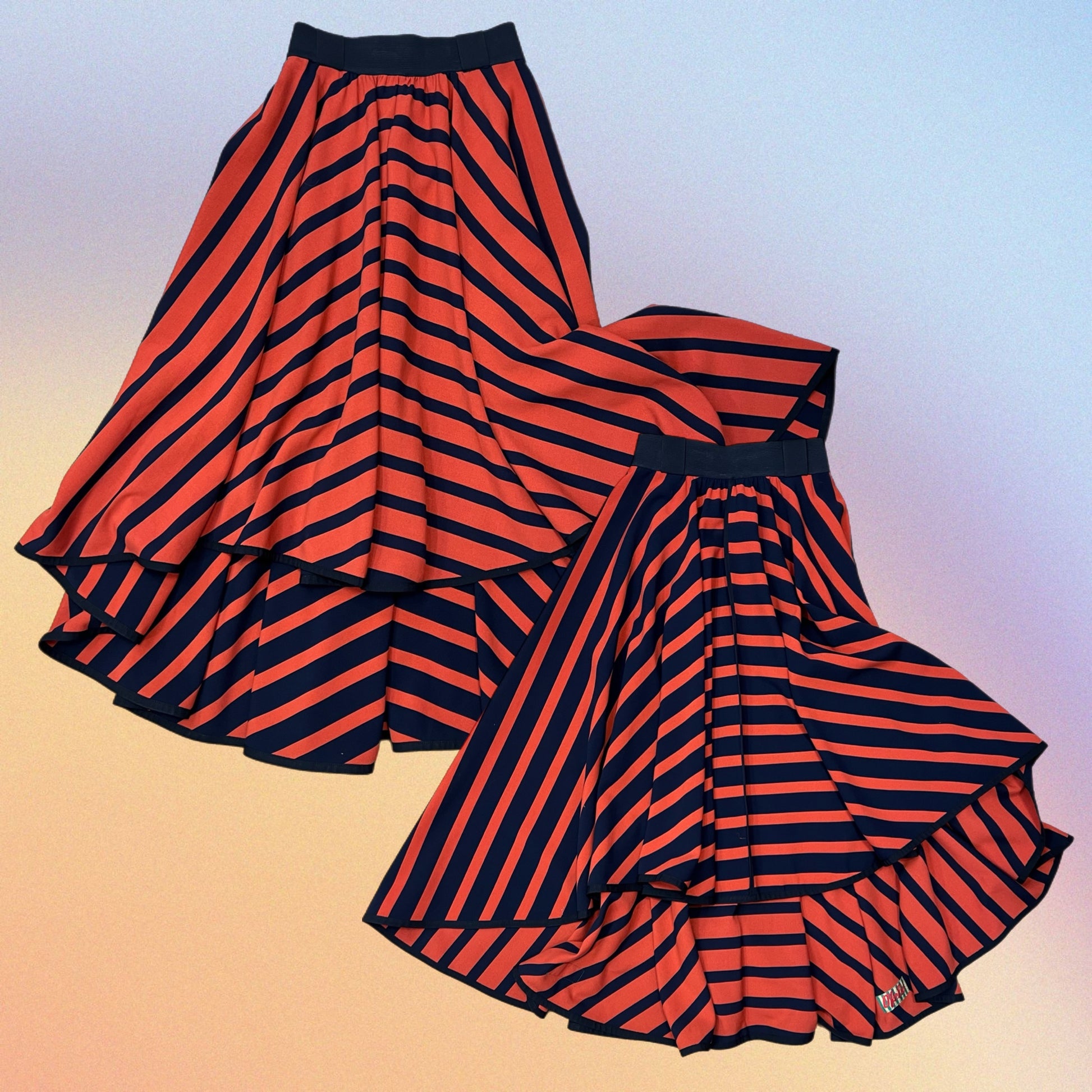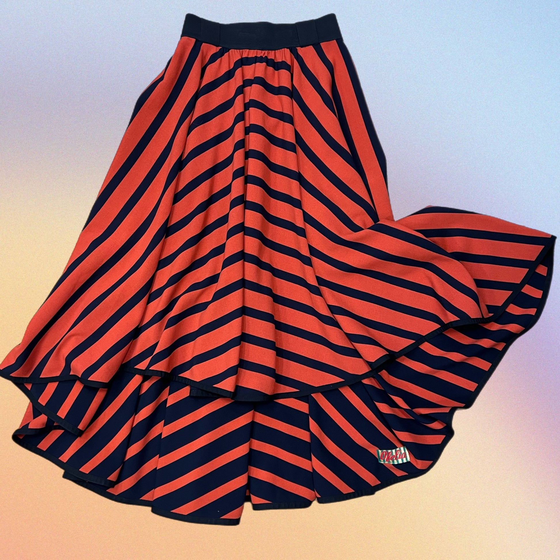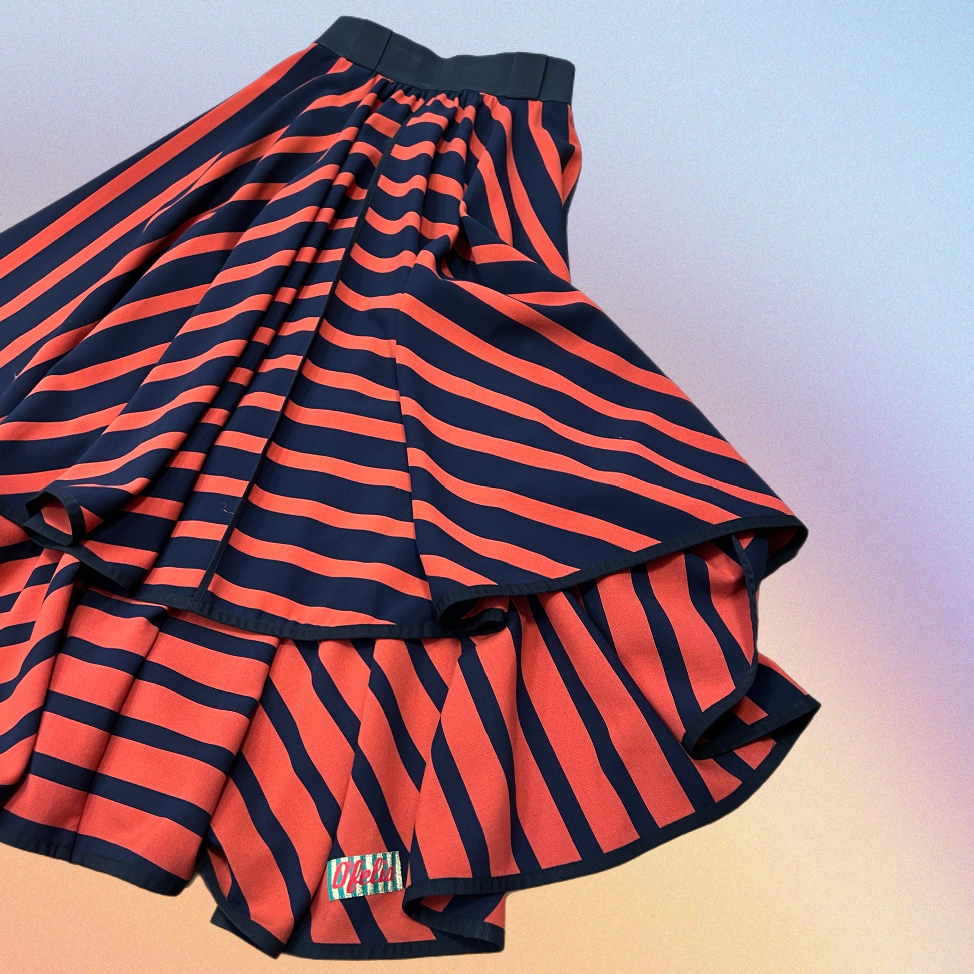 Stragonna doubleface a righe targata Ofelia. Banda elastica in vita con passanti. Interamente profilata in gros grain nero. Taglia Unica.