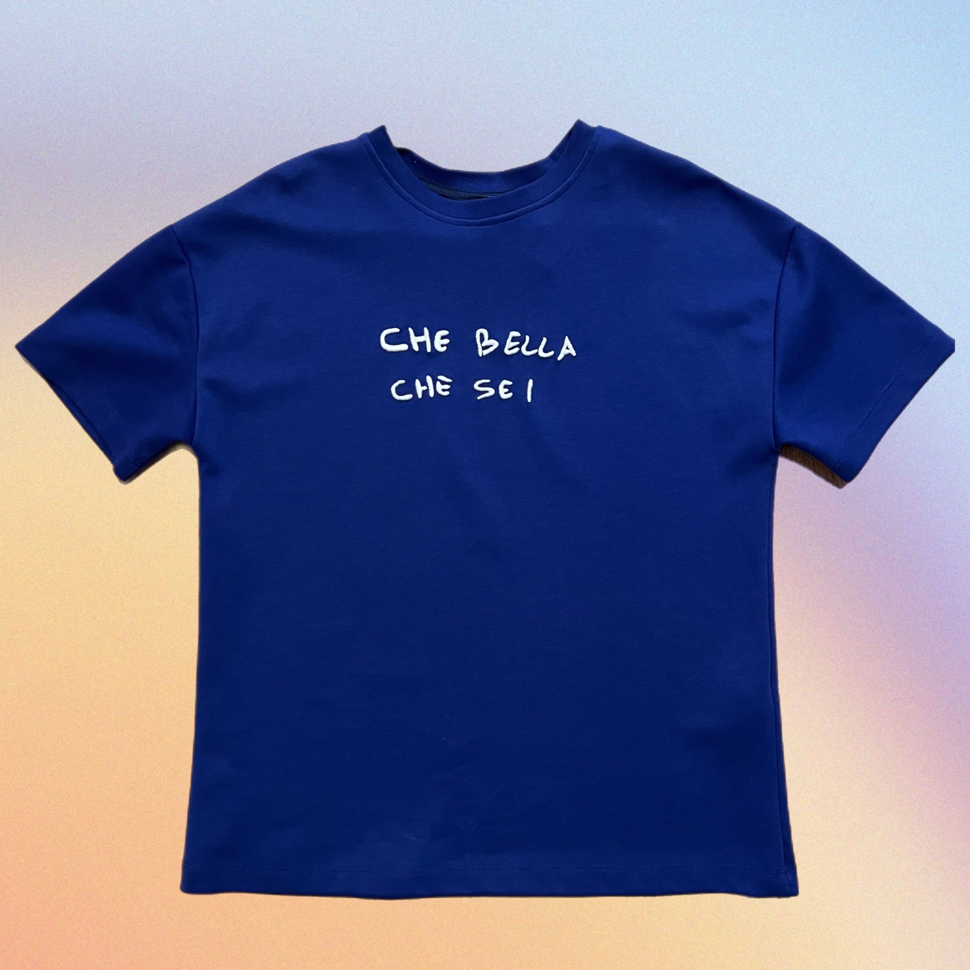 T-Shirt Donna , doppio cotone con ricamo “che bella che sei”. Taglia Unica. Vestibilità Over